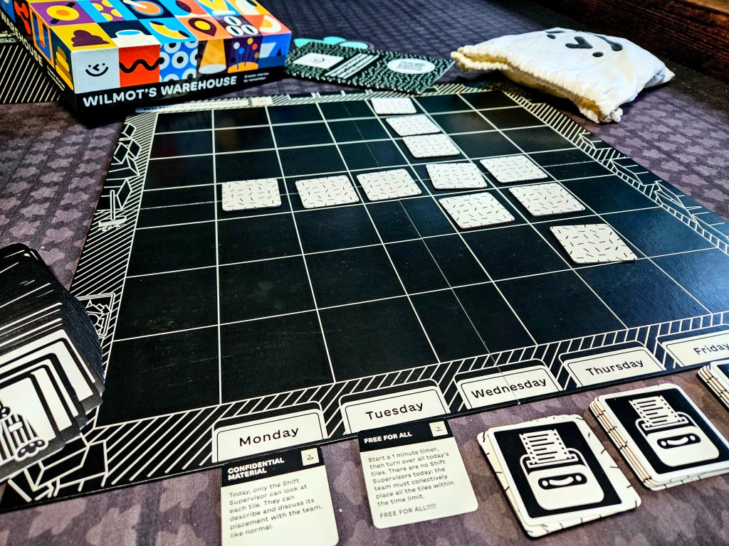Wilmot’s Warehouse (from designers Ricky Haggett, Richard Hogg and David King II) is a cooperative memory game in which players work together to store items in a warehouse and then recall their locations at the end of the game. Each day of play there is some rule that governs the item tiles, for example, only half of the players can look at it. The foreman for the turn needs to decide where to store their item (facedown) in the warehouse. It is up to the players to create some method for recalling where each item was stored, and after 5 days of storing items, there is a flurry of activity as customers make orders and players need to remember where each item was stored correctly.