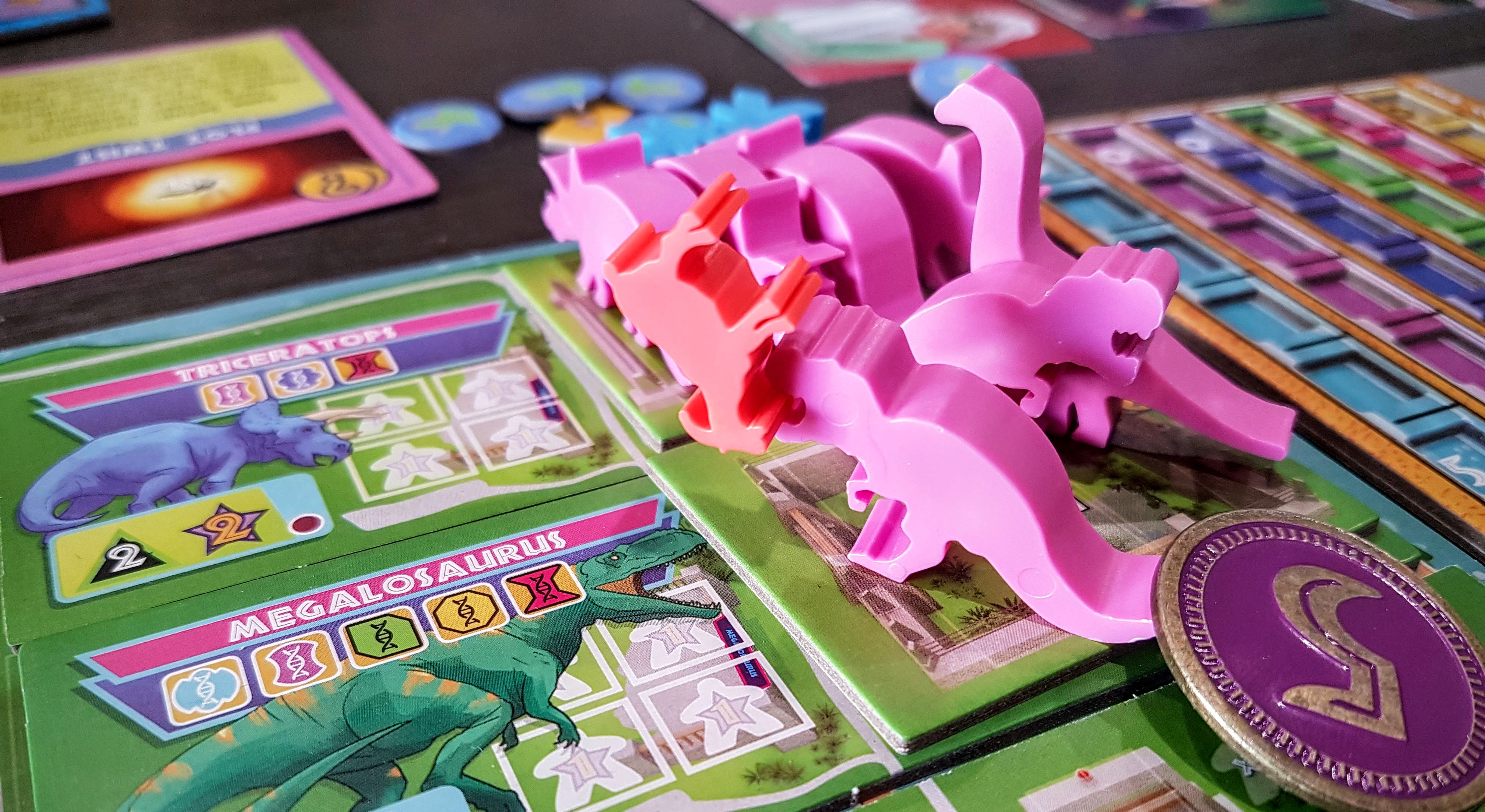 - The theme is very unique, and amazingly well done. The gameplay integration with the theme is so well done, every action feels thematic and there are many nice touches. As an example, the DNA dice are made of ‘amber’, which as we all know from a totally unrelated franchise, is where dinosaur DNA comes from. Nearly every step of the game is highly thematic and carries great humour and narrative.