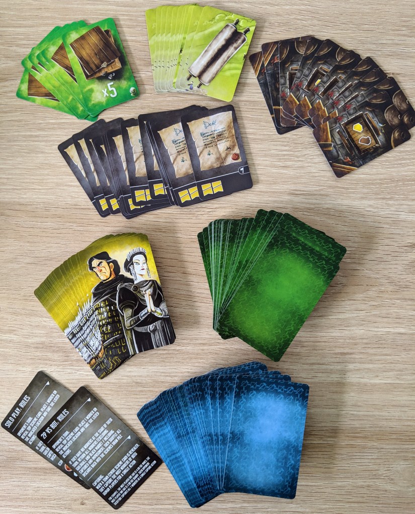 The game features 2 books – one for rules, and one for card explanations. These are just about the same size as the box, fitting snugly inside the lid. I like how each of the books contain vastly different cover artwork, making it easy to distinguish which one you need to grab throughout the game.
