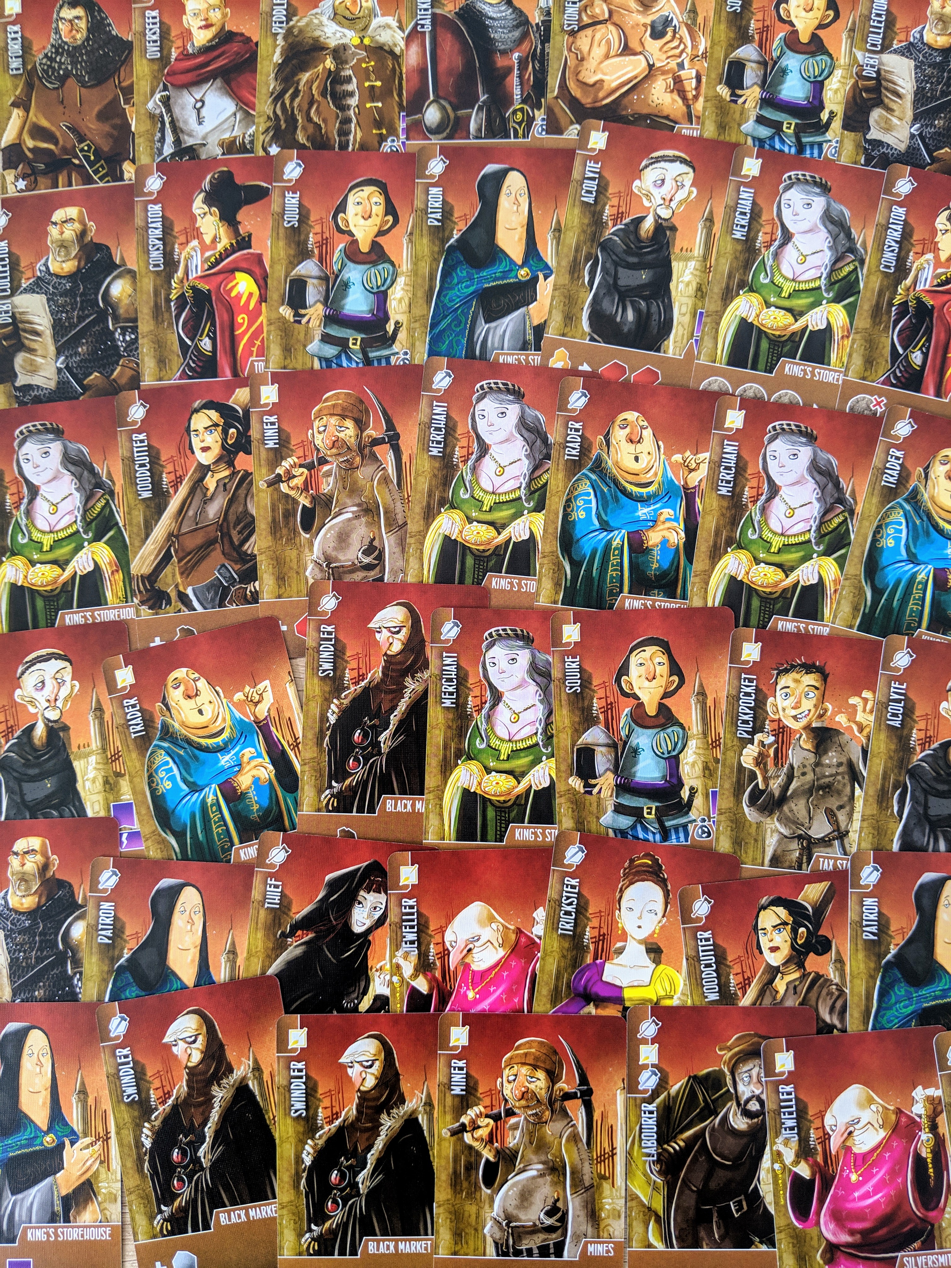 All of the wooden components are beautifully coloured and serve their purpose well. The player pieces are smaller than the usual ‘meeple’, but there are so many that go onto certain spaces that they need to be a touch smaller. If you upgraded to receive metal coins, you also receive a full sheet of cardboard coins as well, which I have not even needed to punch out yet. Another cool little addition to the game is a ‘tax stand’ which holds coins on the board so they don’t spill everywhere. It is even printed with artwork from the game board that it covers, which is neat!