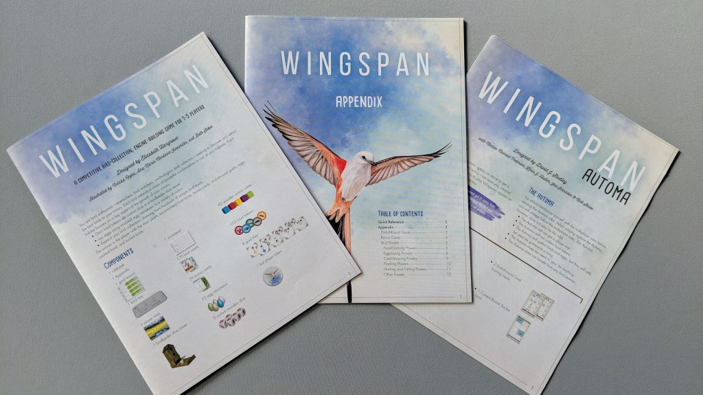 The artwork throughout the entire book is flawless, and all 3 books are filled with gameplay imagery as well as beautiful birds randomly spread throughout. These are not required, and they do flesh out the books quite a bit, but they really add to the beauty of the game.