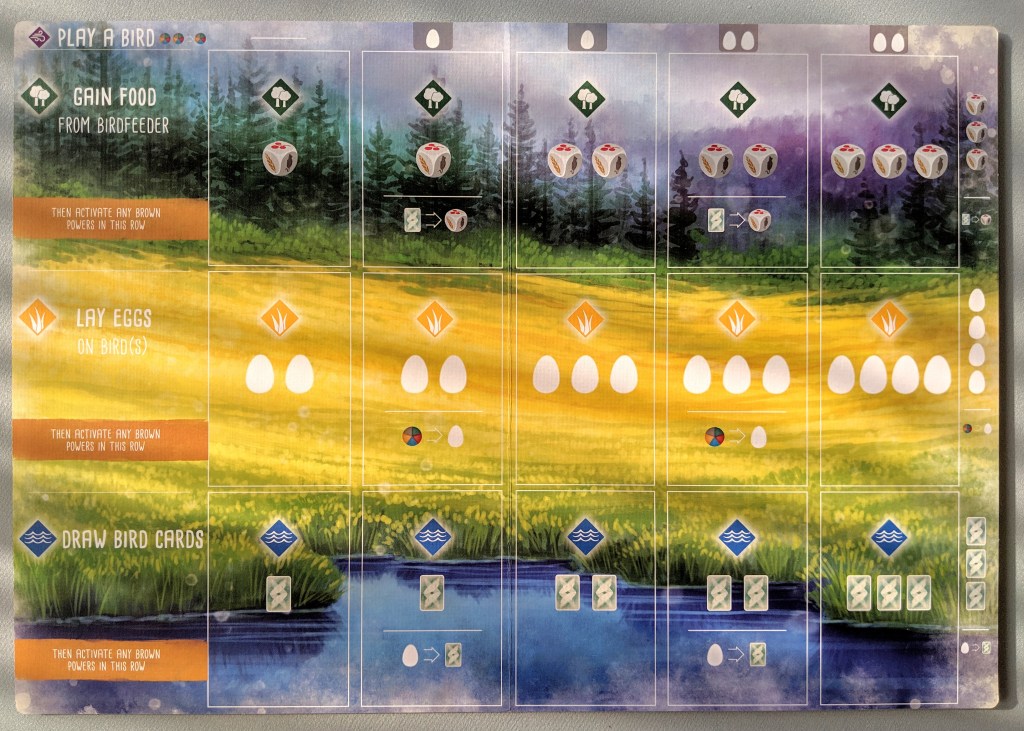 Rather than having 1 game board, each player receives their own individual player board. These can be folded in half for easy storage in the box, as they are actually quite large. The artwork is incorporated well into the overall board design without detracting or making it difficult to see anything. My only comment since playing this a few times, is that people seem to miss the egg payment spots at the top for the ‘play a bird’ action, as it is much smaller than the other action rows. Overall though, the boards serve their purpose well while still looking very eye catching.