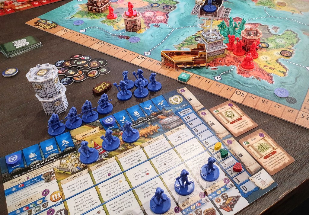 On a player’s turn they have a number of Capital or Command actions to choose from. Capital actions include things like recruiting units, building stuff, and taxing to gain resources, and all of these actions can be followed by other players if they have spare workers to do so. If for example, I chose to recruit, during my turn each other player could also recruit, if they had a spare worker and the resources to do so. Command actions are used to move units, move vessels, and cast spells from spell cards. The Command actions cannot be followed by other players.