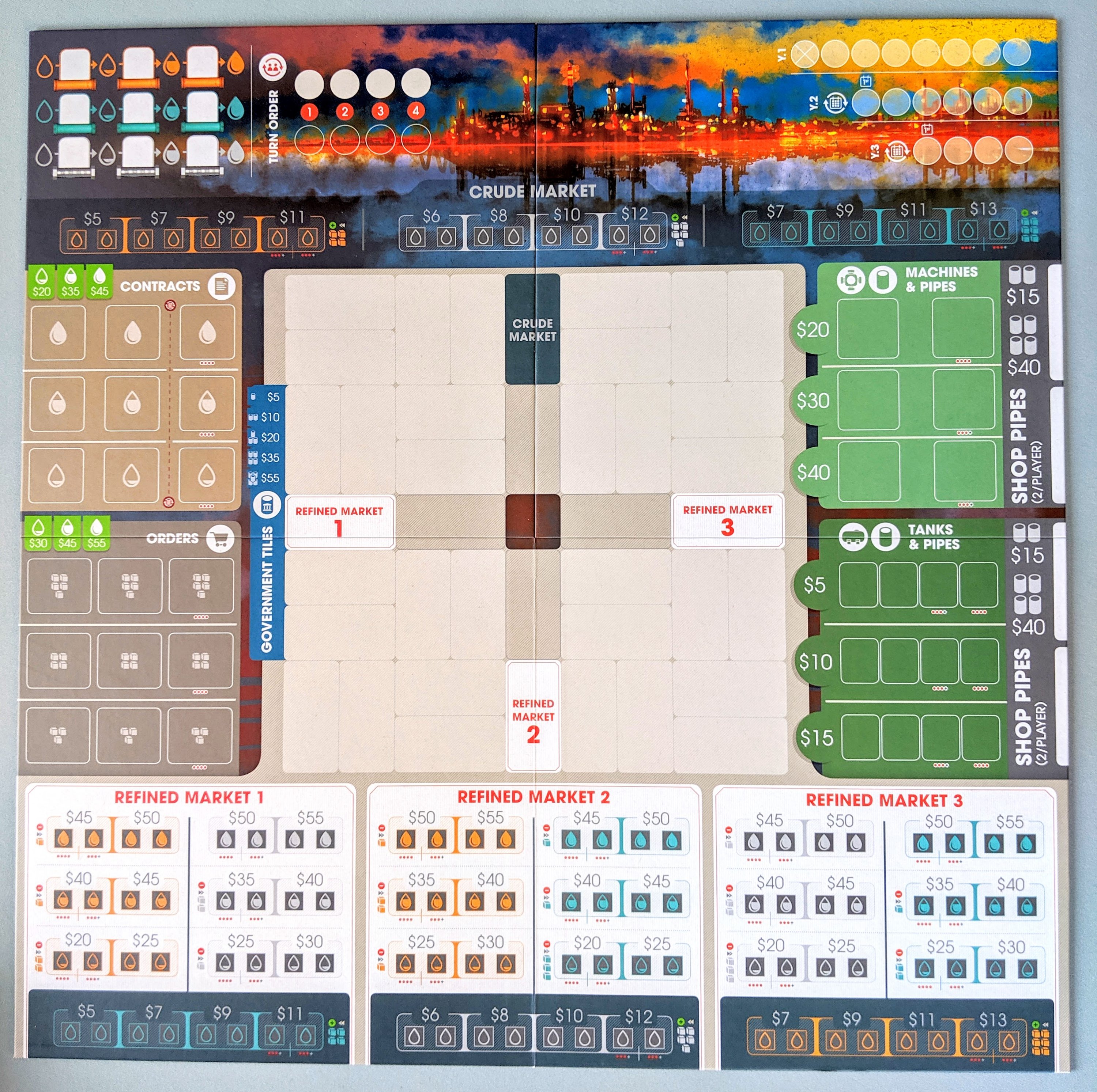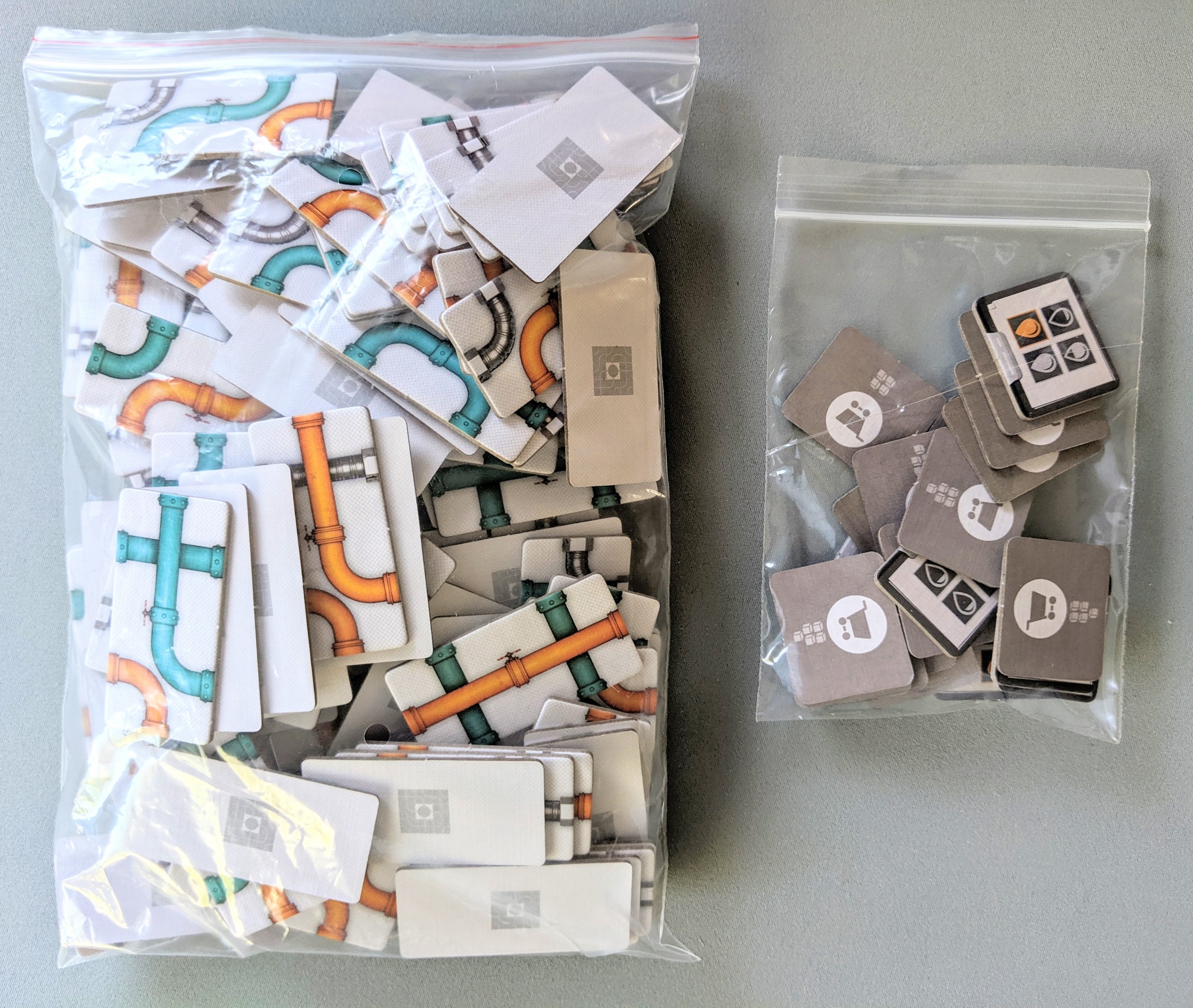 The game board is pretty big, and with every player also needing their own player board and space for their pipes, this game can spread out very quickly across the table. One issue which may present itself could also be the white ink. I know it is not ideal to use white in printing as it can be hard for people with vision impairment, especially in small font such as what is on the individual player boards.