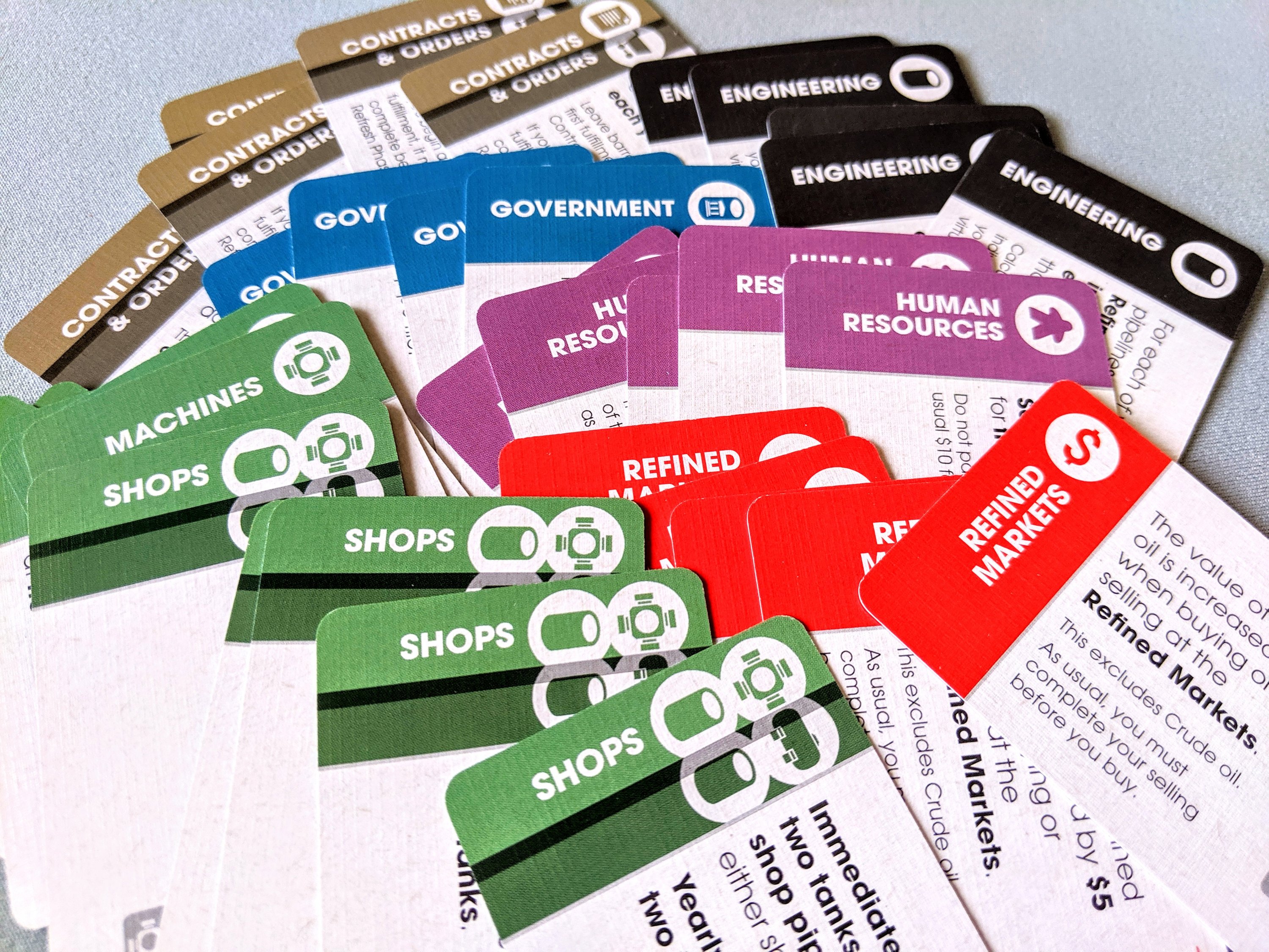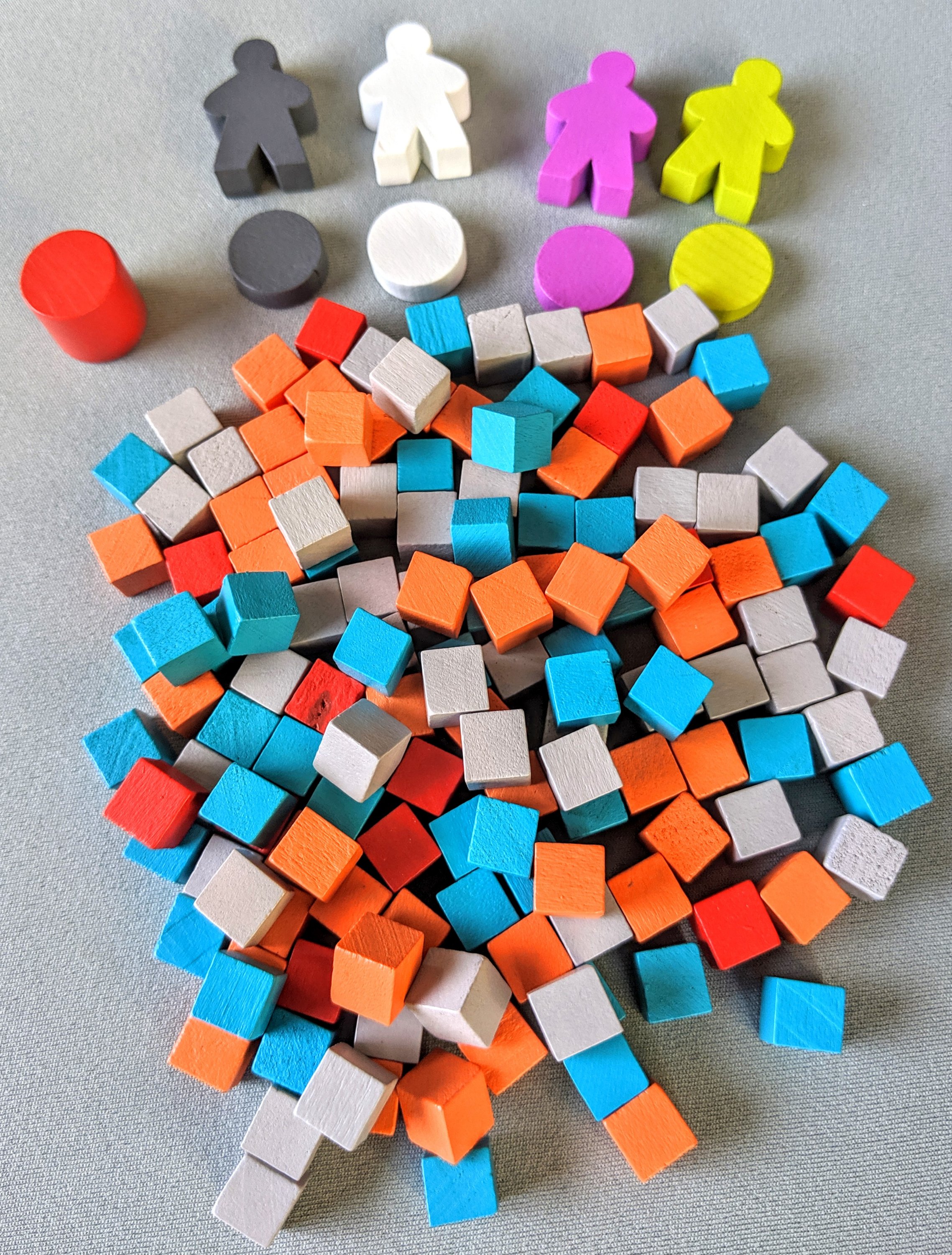 Each of the players just has a meeple and a player token, which are pretty basic but are totally fine. The oil cubes are what could have been upgraded to metal cubes instead of wood during the Kickstarter campaign, but this is not a necessity at all.