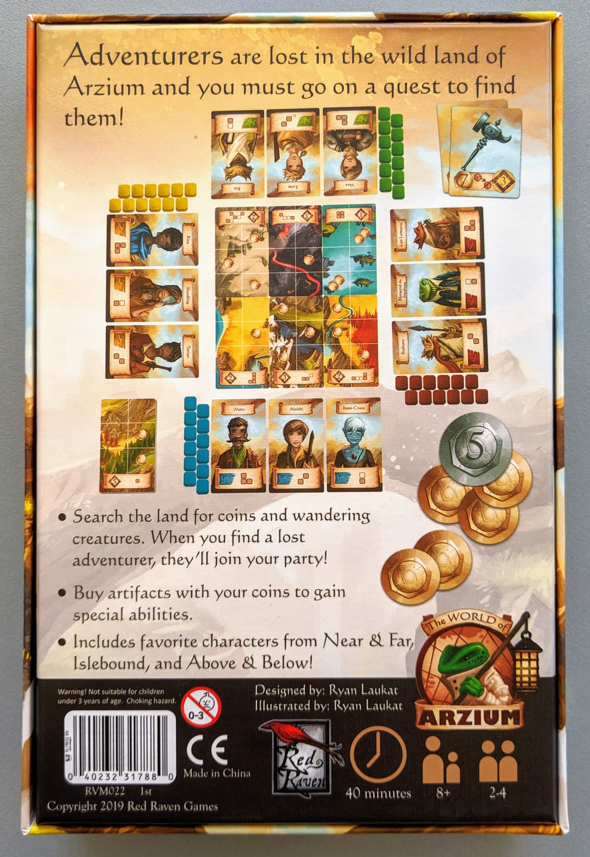 The back cover is nice, and I love it when the game is shown during play on back covers. My small complaints would be that the first word ‘Adventurers’ seems to be in a larger font which seems really strange and distracting. I also find it strange that the lower text is in dot-point form which looks weird to me – it could have just been a few sentences. The coins are also pretty huge in comparison to the game set up which may decieve some.
