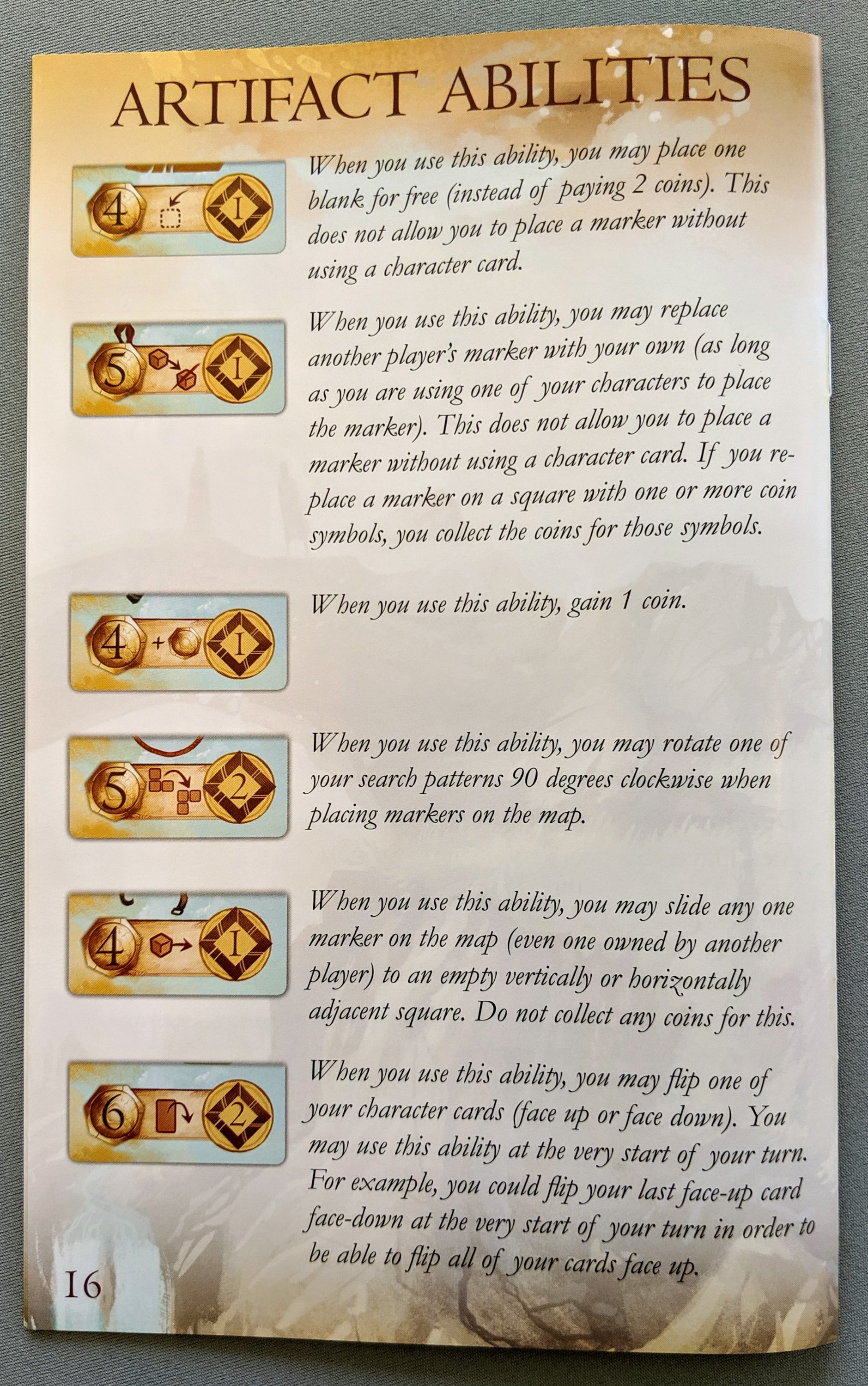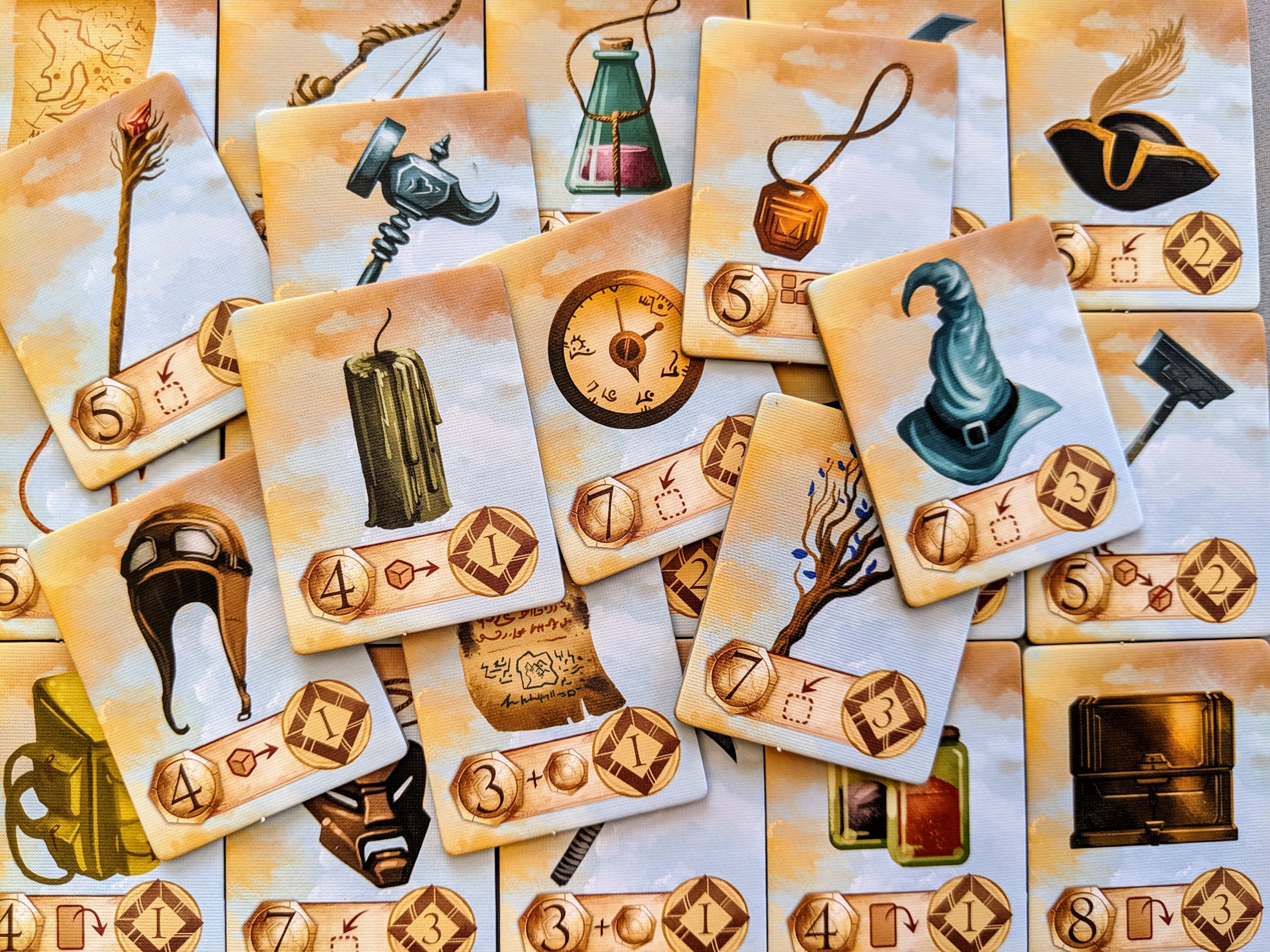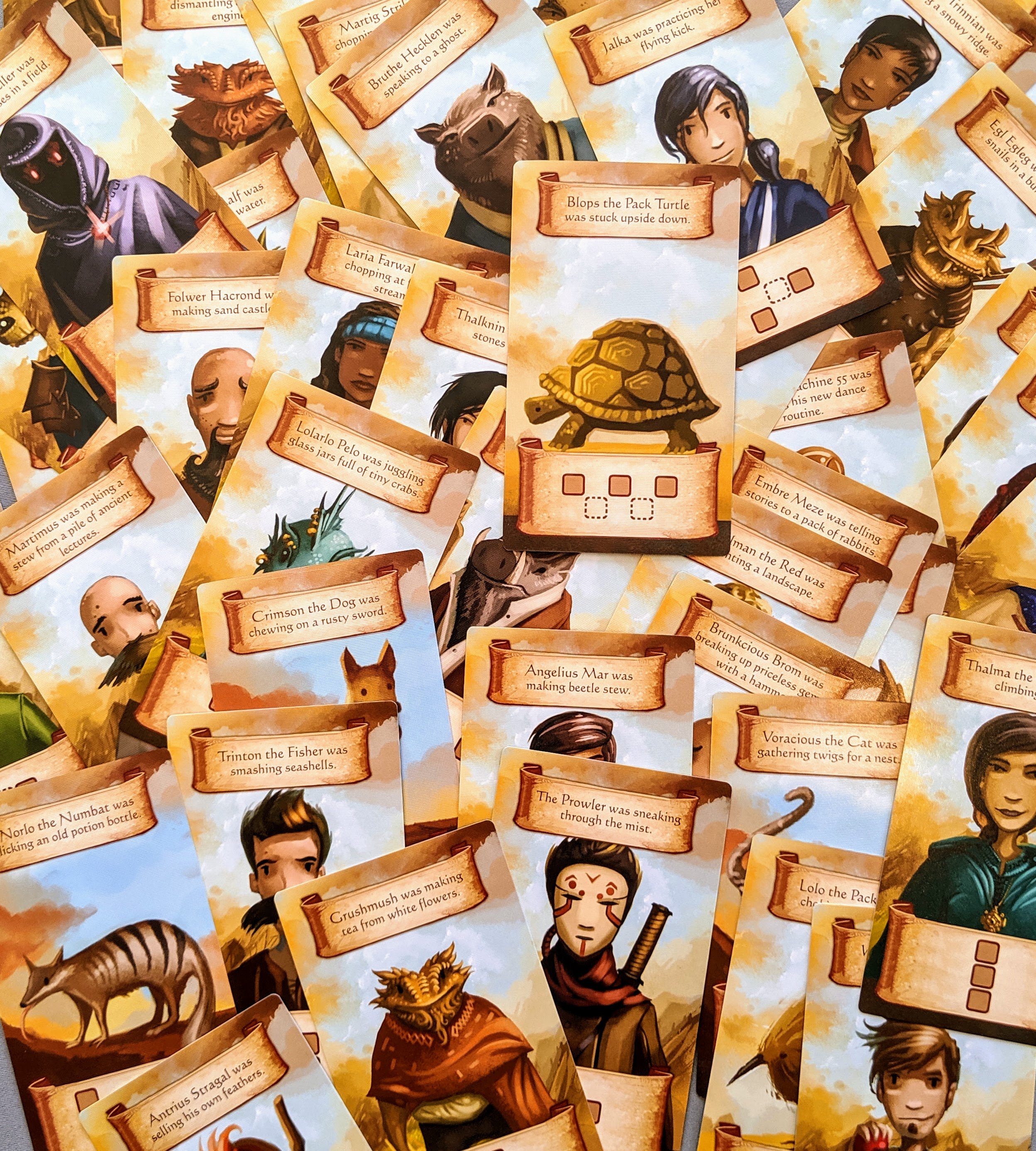 All of the tiles in the game are really nice and thick and all contain unique artwork. They have a beautiful linen finish and are printed double sided with some flavour text on the backs.