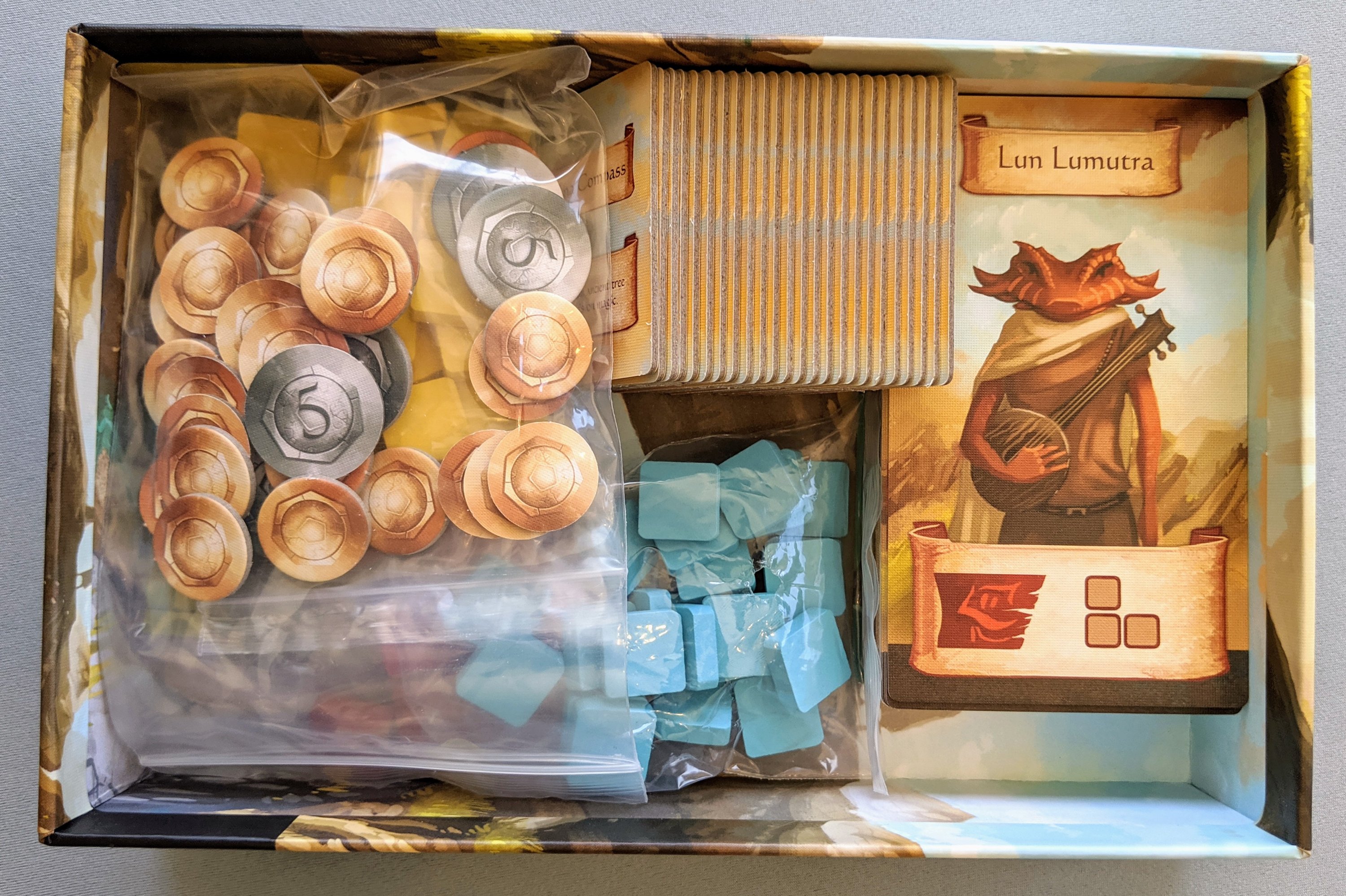 The components in the game are pretty basic, but you don’t really need anything more fancy. Part of the Kickstarter was an option of metal coins which would have been nice and I regret it a lot! But the cardboard ones are still quite nice and thick with a linen finish.