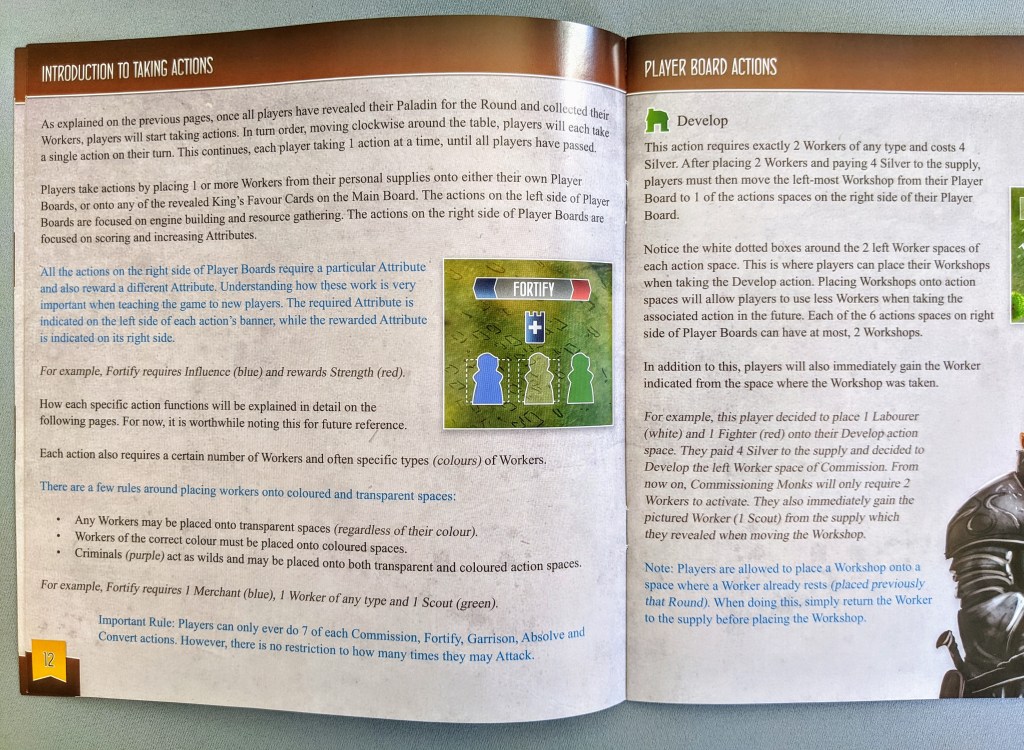 All of the actions are explained really thoroughly, and the rulebook is actually quite thick. I didn’t find it that difficult to learn the game, and I really like how key points throughout the rules are highlighted in blue text to draw attention to them.