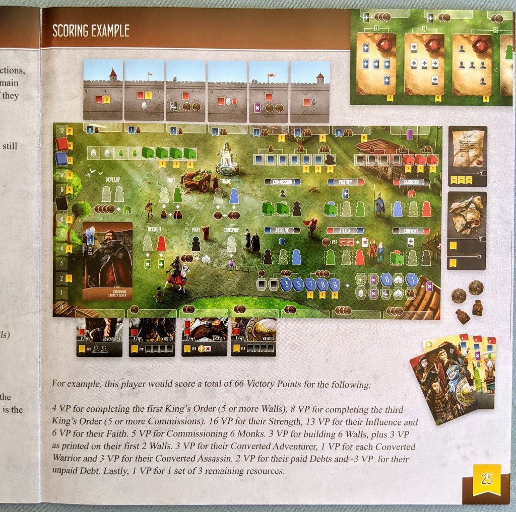 The scoring example in the back is super helpful, and runs the player through exactly how any points are scored using a large example image of a player’s board so you don’t miss anything.