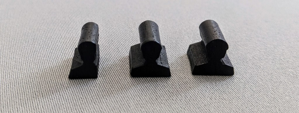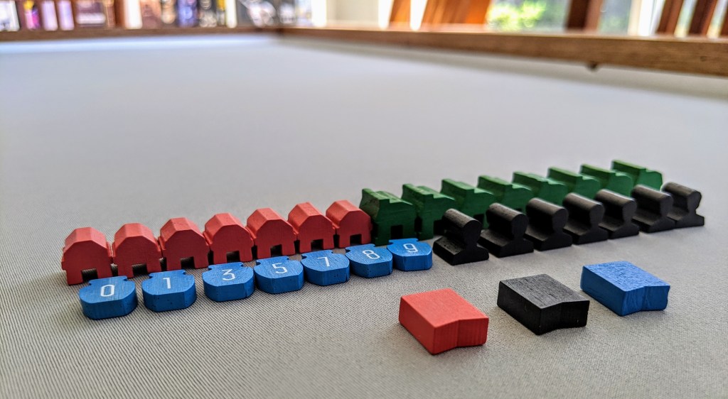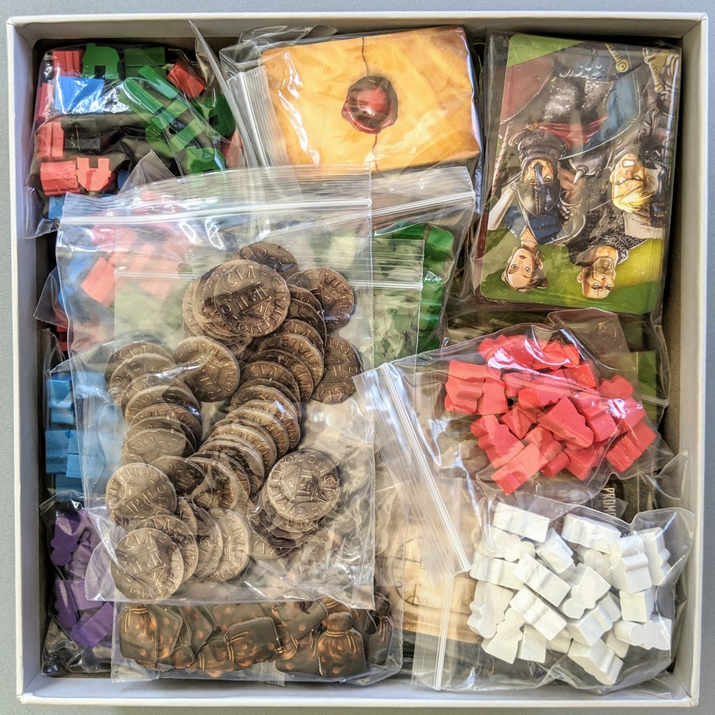 The coins and provisions are just cardboard, but I can always add the metal coins from Architects. This game is quite different in that there are no player colours, just a main supply of coloured meeples which is cool.