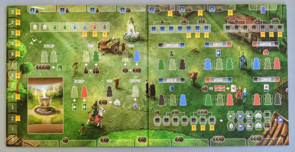 Paladins of the West Kingdom is the follow up game from Garphill Games in the West Kingdom Trilogy. In Paladins, you will be managing your faith, strength and influence in order to defend your kingdom, appoint Monks, and spread faith throughout the kingdom, all within 7 rounds!