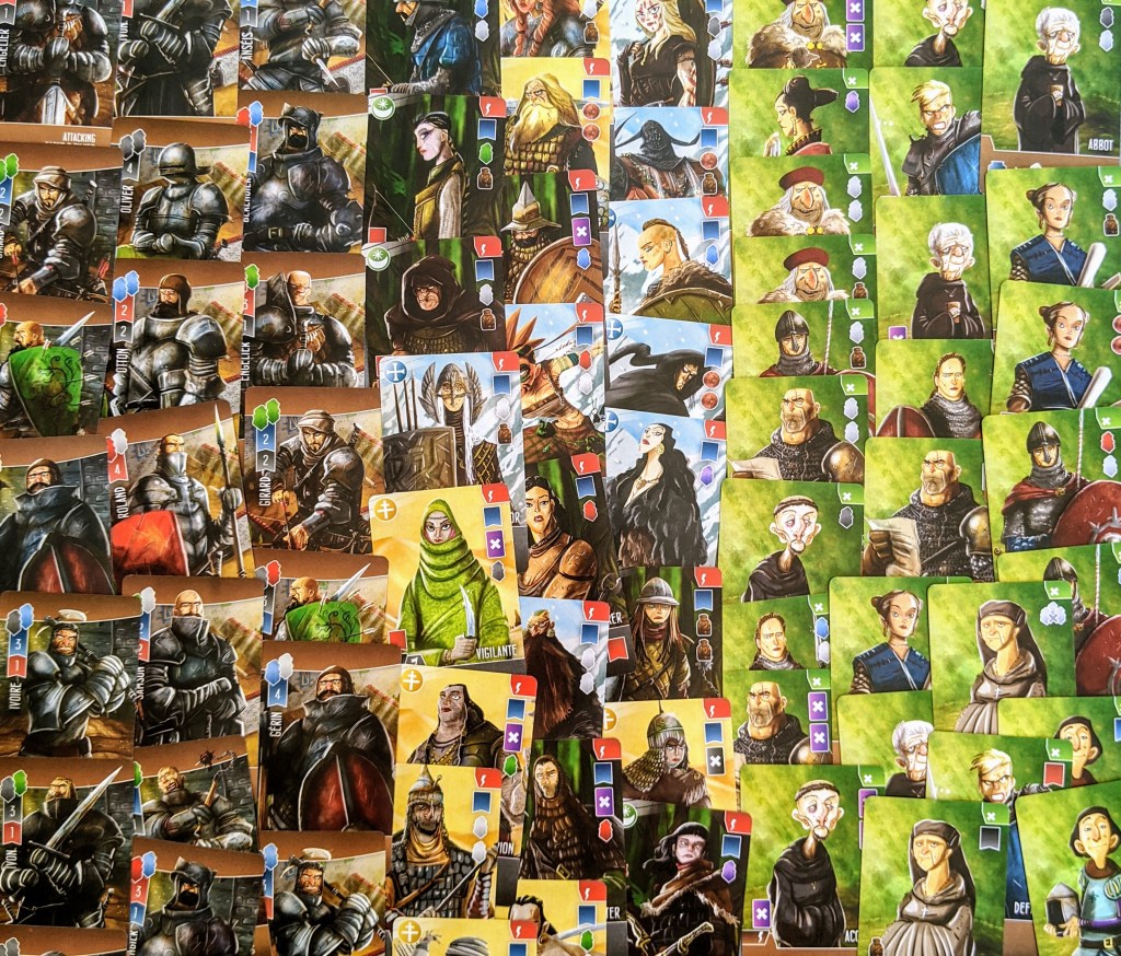 The player board shown below can seem a little intimidating at first, but once you learn the game, the layout is really clear and simple. There are a lot of icons, but they basically just outline where certain meeples go and I think the boards have been really cleverly designed. I also like how there are cute little details in the background artwork as well, such as a little pig, and different characters in your kingdom. Each board also shows a different ‘deck of cards’ image, which reflect the individual player deck which is a nice little touch.