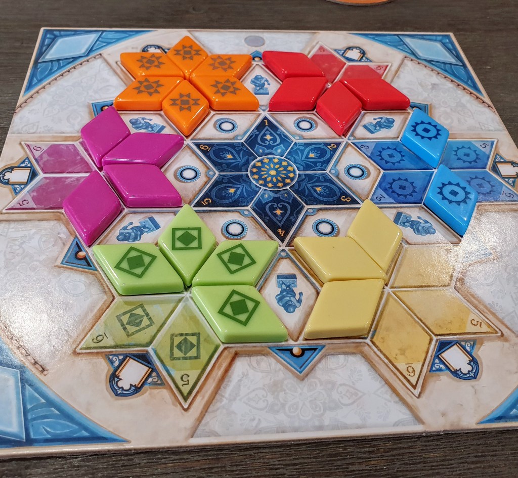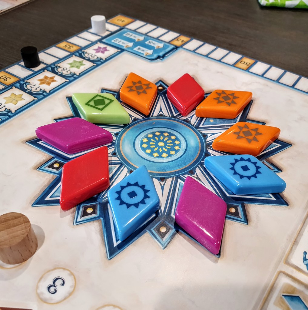 After 6 rounds (one for each wild tile colour), players will tally up bonus points received from completing 6 pointed stars on their board, and determine the winner. Similar to Azul 1, the majority of a player’s points are earned throughout the game, with end-game points often making a difference in placement.