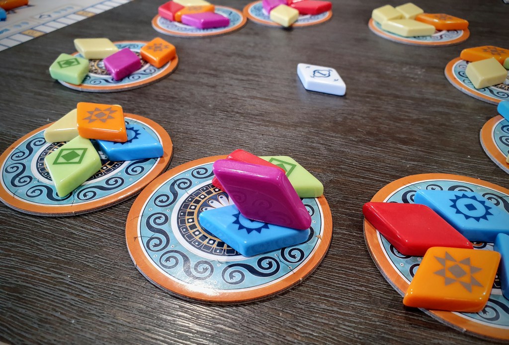 The geometry of the board provides a number of bonus spaces that when surrounded with tiles, earn the player bonus tiles from a selection in the middle of the table. These are added to the player’s pool of tiles available for placement. Finally, ‘wild’ tiles allow players to substitute missing tiles to needed for placement with the wild tile of the round, allowing for some flexibility and and interesting new strategy considerations.