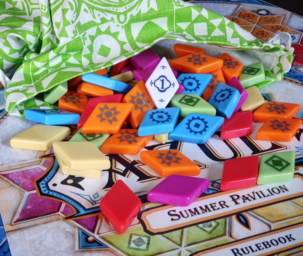 This review is going to be a bit different to the usual, because Azul: Summer Pavilion is a sequel of sorts. Since that’s the case, and it shares a lot of similarities with the original Azul, I’m sort of going to build on my review of that, and mostly discuss variation/differences between the two versions. If you would like some context, (my opinions on the original Azul game and some details such as how the game works) check out the Azul Review here. Azul: Summer Pavilion (or as we have been calling it, ‘Azul 3: The Azul-ening‘, is indeed the third entry in the series. I played the second game (Azul: Stained Glass of Sintra) once but it didn’t really appeal to me in any way. It had quite a different feel to Azul 1. Azul 3 seems to be more of a return to ‘Azul Classic’ and feels much more like the original, albeit refreshed, reshaped, and reinvigorated.