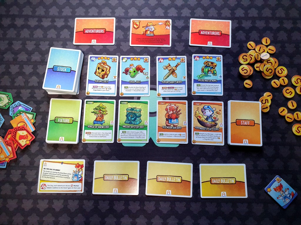 Generally players will spend the first few turns in a round stocking up on goods and then start making sales to adventurers. A round ends once all the adventurers who have come to visit have made purchases. At the end of each round, the market is reset and players get ready for another round of adventurers visiting. After 5 rounds, players tally up their cash on hand and the value of all their stock, and whomever made the most money is the winner!