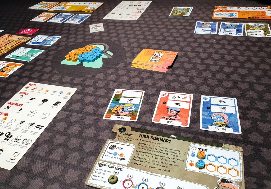 Fort is a deck-building game that has follow the leader action mechanics and a lot of opportunities for player interaction. To begin the game, each player grabs 2 best friend cards and a 8 random kid cards to make their starter deck. Play proceeds in turns around the table and continues until one of the 3 end-game conditions are met – the park deck runs out of cards, someone reaches 25 points on the score track, or a player completes their Fort. When this happens, bonus points are tallied on and the Fortiest Fort wins!