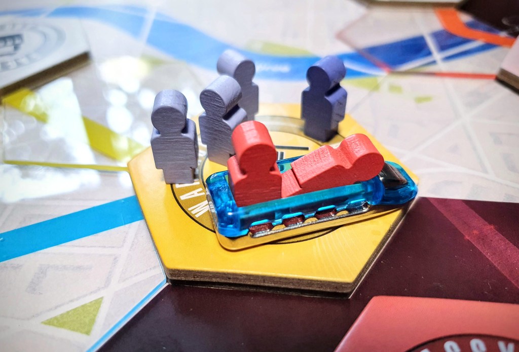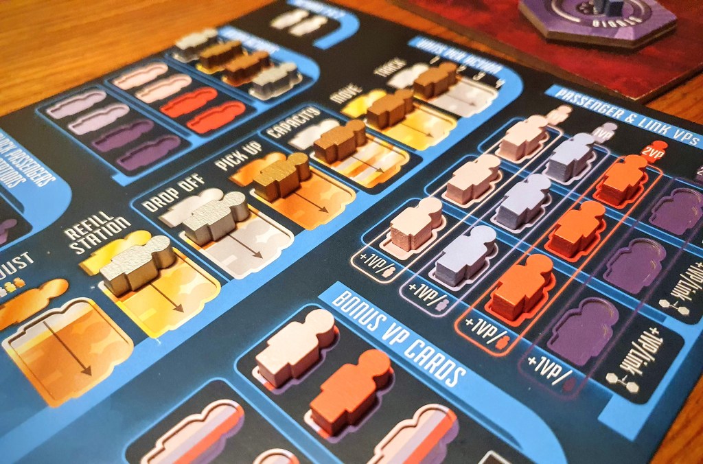 • The chosen colours for the passenger meeples are really not ideal. I have no colour vision issues and I have had a lot of trouble. The gold/bronze and the two purple colours need to be compared constantly to confirm which of each they are, as only next to each other are they easy to distinguish. This issue exacerbated in less than ideal light conditions.