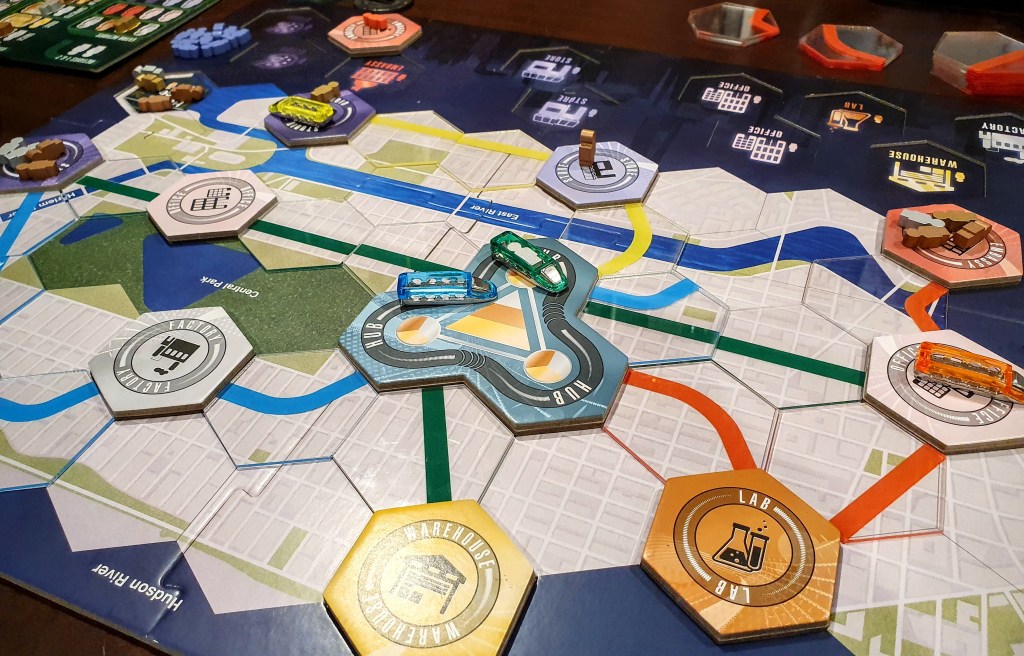 • I found the recommendation in the rulebook to play the Manhattan map first odd. This is because I feel like while it does make the game a little easier, it’s a bit more confusing to learn the game on because the hub station breaks a few of the ‘golden’ rules of the game. I did try introducing players to the game on both maps and I think that players generally had an easier time developing strategy on the Berlin map if it was their first time playing.