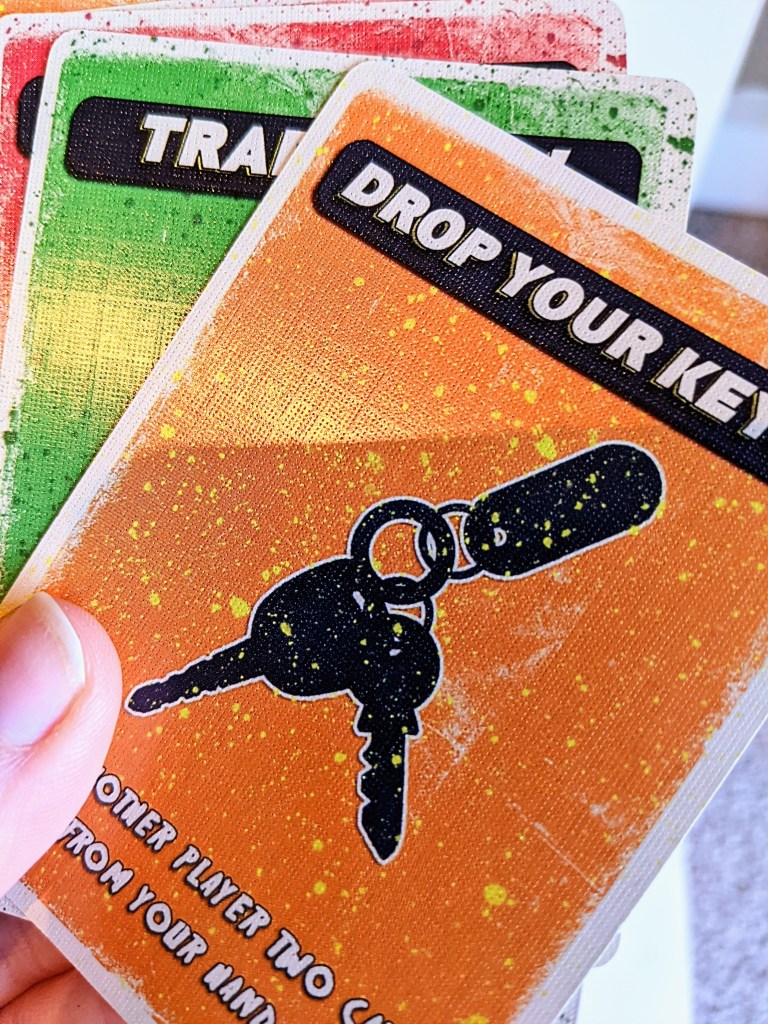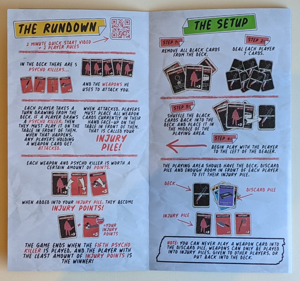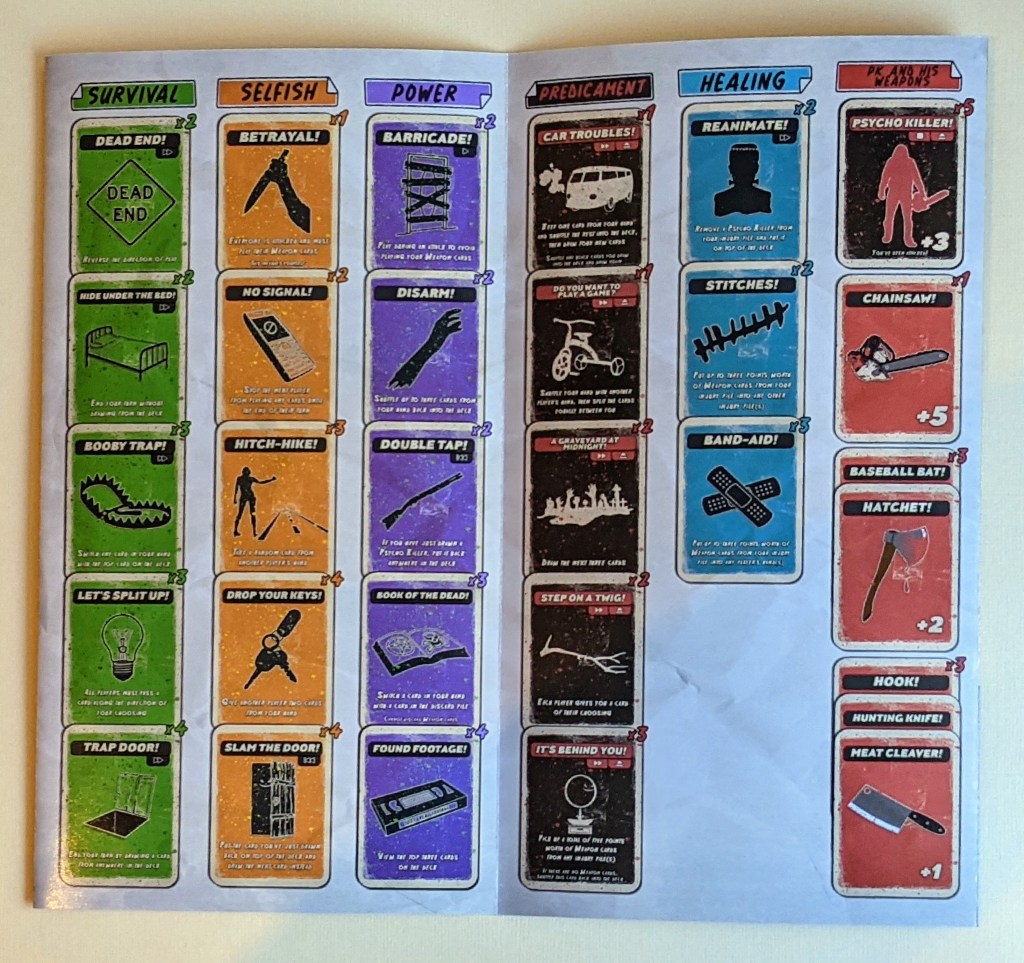 The insert within the box is created from a thick cardboard which is cut / folded to create spaces for the cards. It definitely does it’s job, as no insert is really required. It is also printed with various weapons and spattered with ‘blood’ which is a nice touch. The cards all fit very easily into the spots, with room for the expansions in there are well. I do not sleeve cards, so I am unsure whether it is sleeve friendly.