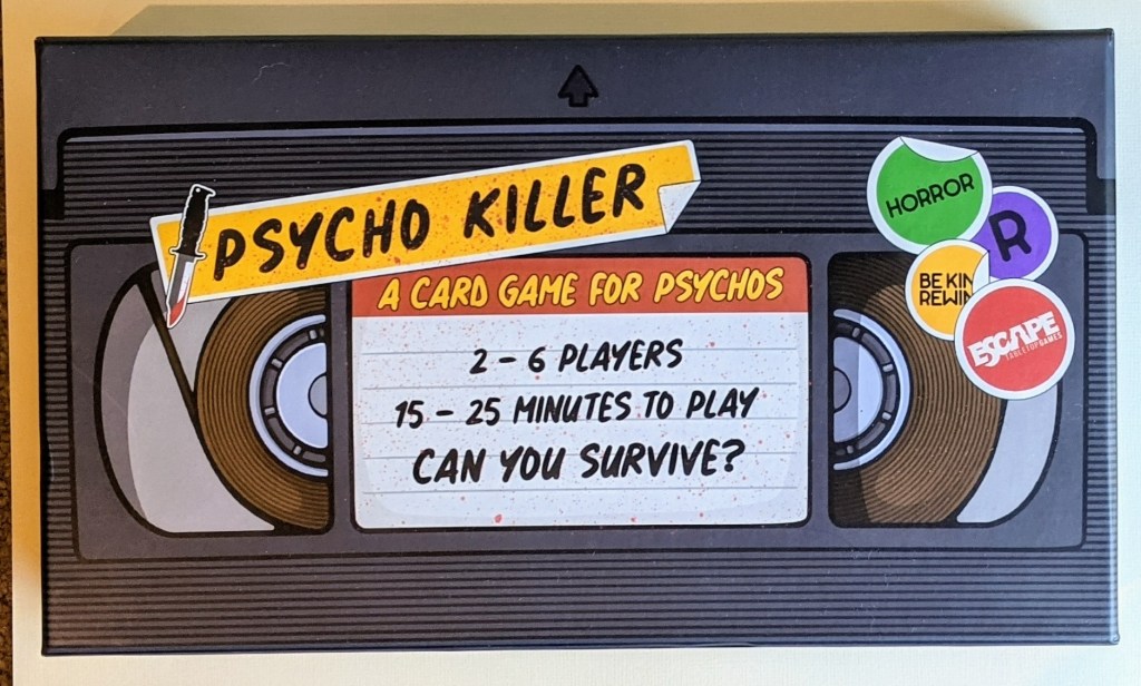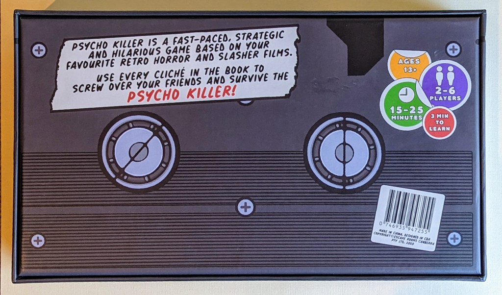 The box for Psycho Killer looks really eye-catching and unique. It is themed as an old-school VHS Tape – hopefully knowing what these are doesn’t expose my age!