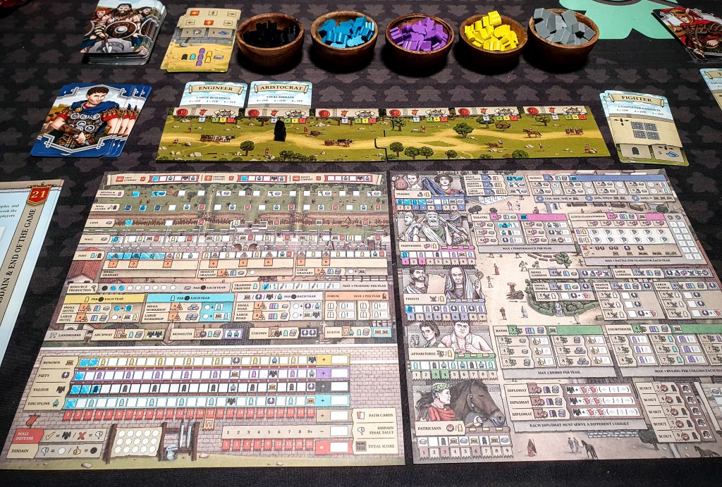 - Hadrian’s Wall has a LOT of ‘minigames’ on the sheets. While there are some general principals to the game, there are so many areas to teach and you have to fully go through them all up front because they all work in pretty different ways. I don’t mind a challenging teach, but for others this could be a ‘watch the video before coming over’ sort of game which is a little unusual for something of this weight/complexity. That being said, don’t worry about the game being too complex to play. Once you know what you can do, doing those things is very straightforward.