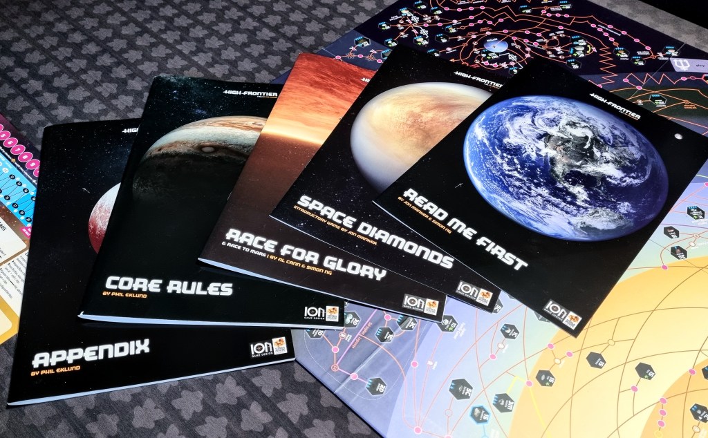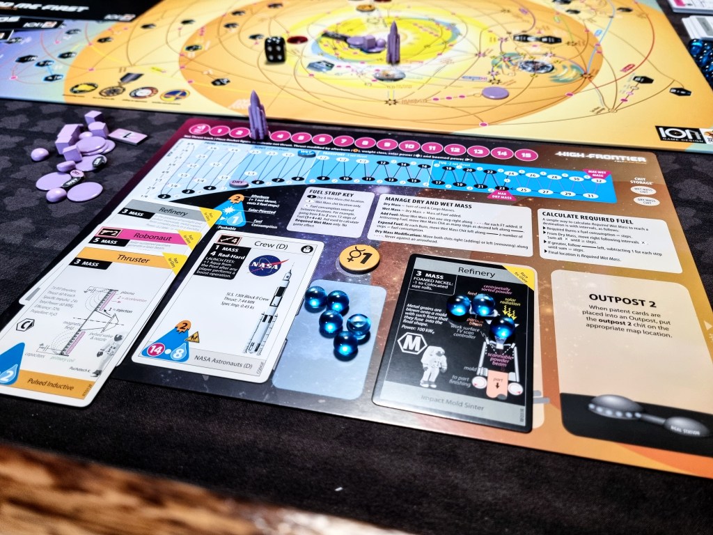 I’ve recently gotten the chance to explore High Frontier 4 All, the fourth edition of Phil Eklund’s science based space exploration game. This post is somewhat of a first impressions write up, given I have only played the game twice at this point, and haven’t fully explored the core game yet. I know there is a big community of hardcore High Frontier players, and I’m not writing this for them, I’m writing this for boardgamers who might be interested in giving this game a go. The two games I’ve played have been of the ‘introductory’ Race for Glory mode of the game, which strips out a few of the more complicated elements of the game while retaining most of the fundamental mechanics.