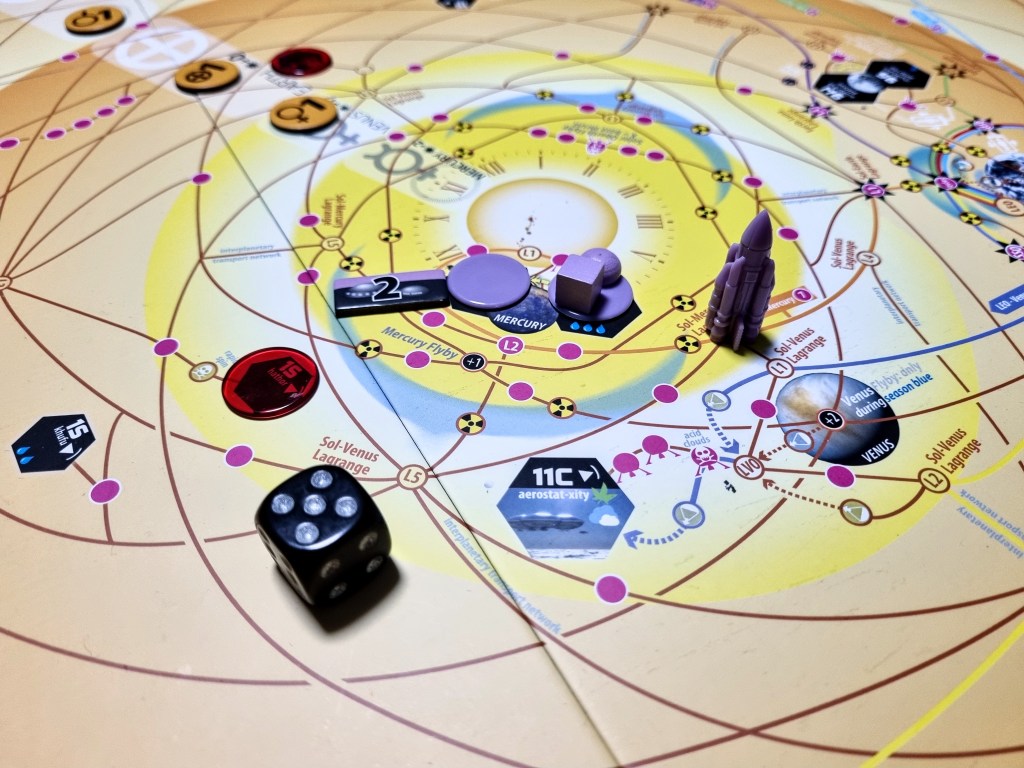 To make burns you need reaction mass, which you store in your fuel tanks and keep track of on your player sheet. The player sheet has a gauge that lets you keep track of your rocket’s current mass and fuel reserves, and when you make a burn you deduct some fuel from the rockets stores according to the thruster you used. I found the system pretty intuitive and prefer it to the system used in Leaving Earth. Even though it’s a bit more complicated, it’s more interesting. Additionally, High Frontier is a bit more forgiving as it allows for ‘free movement’ at the start of each turn which can let you be a bit more flexible if things don’t go exactly to plan.
