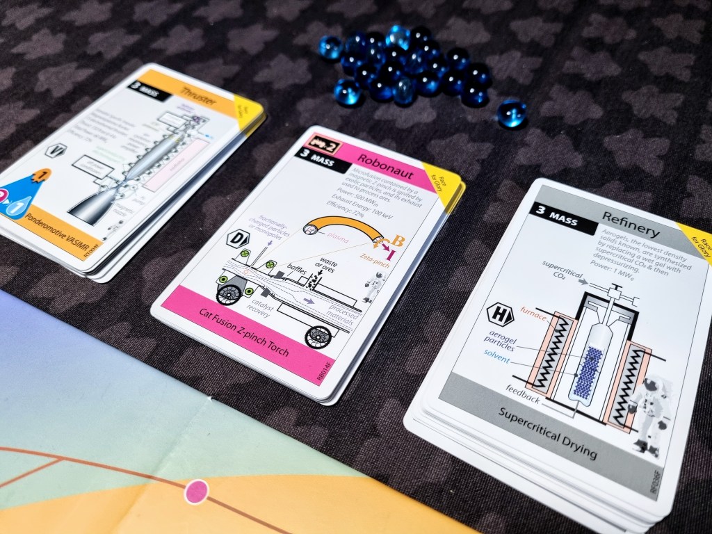 Once you’ve got all the parts you need to run a successful mission, you just need to save up enough Aquas to launch. Now, what a successful mission ‘is’ depends on what you want to do, but in Race for Glory, you pretty much need 2 components (crew & thruster, or thruster and robotnaut) to do a survey or bring back a glory token, or otherwise three components (thruster, robonaut and refinery) if you want to build a factory somewhere. I mentioned saving up enough Aqua to launch, and I found this process particularly painful, as it’s essentially waiting around for several rounds to get the aquas to boost your parts into orbit, and then another few rounds to get the aquas you need to move your rocket through space. So you are just buying and throwing away cards for maybe 5 rounds to achieve this.