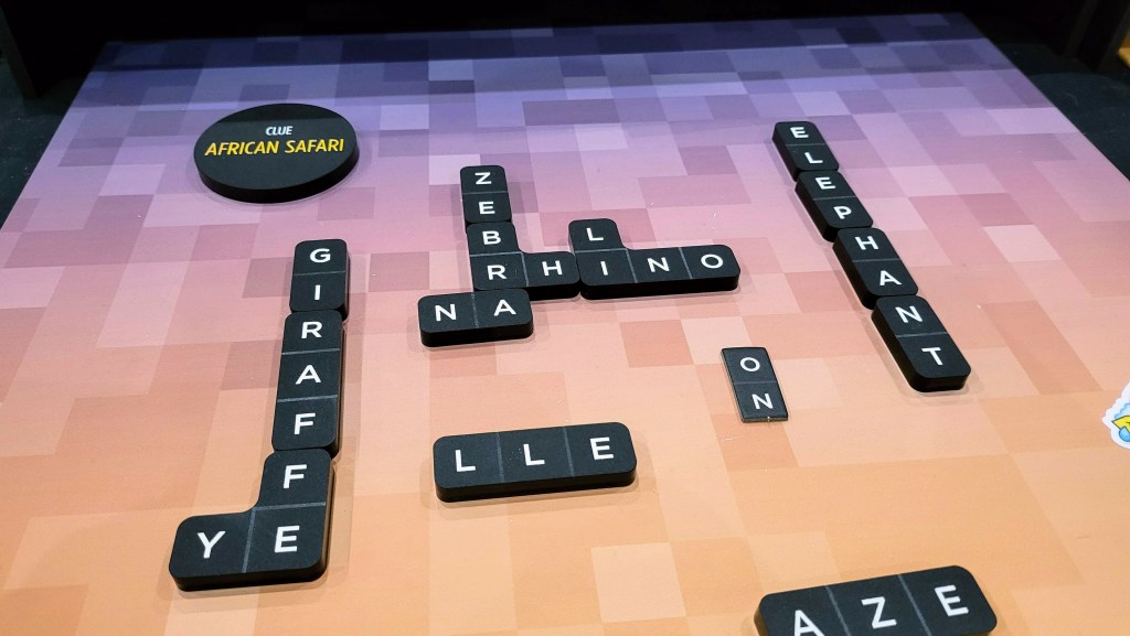 This game is actually a physical manifestation of an App that provides the same experience. I had a quick go – you are essentially trying to arrange the provided fragments of words into a crossword that satisfies the given clue.