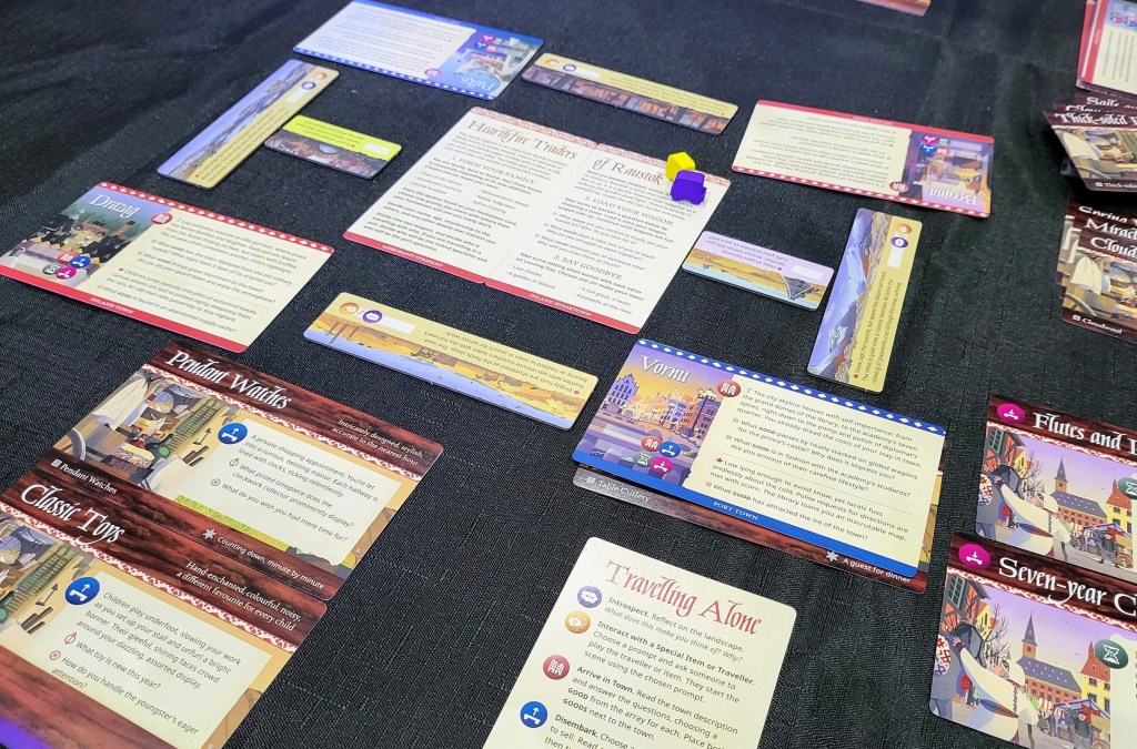 In Saltfish & Almanacs you take on the role of a travelling merchant, buying and selling goods through several towns during the trading season before heading home for the winter. The game has ‘actions’ and ‘resources’ in a sense, but there is no scoring or victory conditions, the whole experience is about telling the story of your merchant as you travel the land and encounter new people and places.
