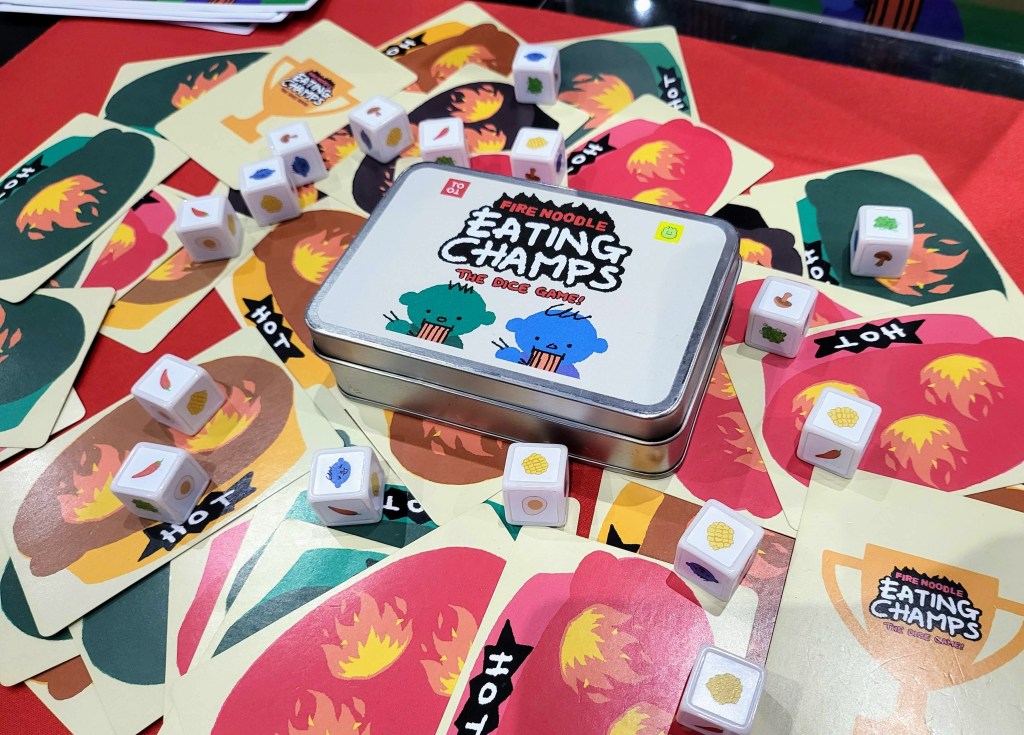 This game from designer Jason Tam is a hectic real time dice rolling fest. Players are competing to see who can smash through bowls of fiery hot noodles the fastest by franticly rolling dice and matching symbols on their dishes the quickest.