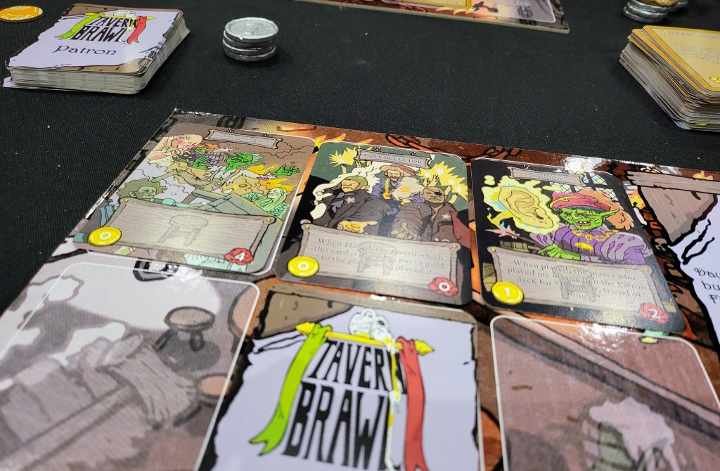 Players make money by playing patrons into their Tavern, and try to incite brawls in other player’s taverns by filling them with rowdy patrons. At the end of each round, if the sum ‘rowdiness’ of your patrons is below seven, you earn their payout, otherwise you will have a brawl in your tavern and need to pay to fix things up after.