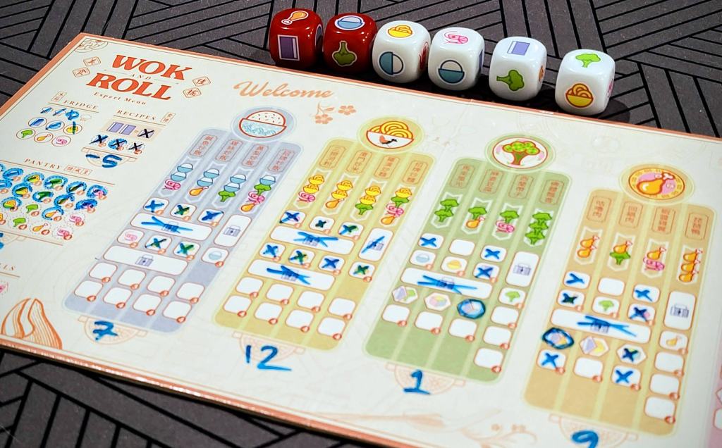 Wok and Roll is a cute and compact roll-and-write game from Origame, a Singaporean publisher that has recently started to bring their games to the west. I was lucky enough to meet Daryl Chou, the designer of all the games in the Origame catalogue at PAX Australia in 2023. Wok and Roll gives each player a menu card filled with uncooked dishes. Players collect ingredients from the dice which are rolled each turn, and use them to try and cook as many dishes as they can before the game ends – trying to get the most points from making the most delicious meals!