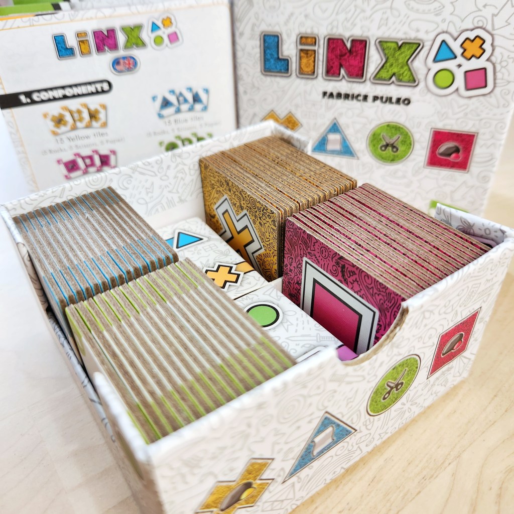 Linx plays in about 15 minutes and can accommodate 2-4 players. I’ve really enjoyed it at all player counts. The box is perfectly sized (nice and small!) and very well designed. These little things bring it all together and make it the perfect portable game, which is great for a quick game over coffee.
