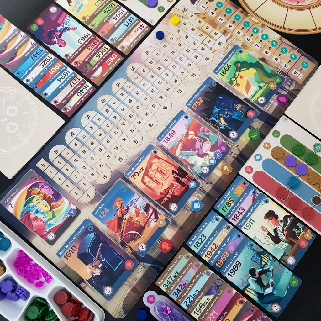 On your turn, you get to choose which period to visit from the row of cards on the colourful playmat. Each card shows the year an event took place, the time cost to visit it, plus any benefits it provides. You earn points by collecting big runs of cards that go from the past to the future in order, and by unlocking the bonuses shown on your itinerary board. At the end of three days you return to the present and whoever has done the best job can declare victory!