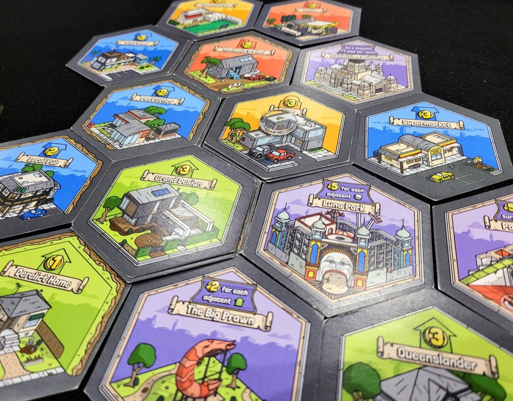 The first game I sat down to play was Towns Down Under. This game was a bit of a cheeky take on an Australian town building game from designer Daniel Marin. The game is all about building a town out of hexagons and features a very thick coating of Australiana which I loved. I also found the artwork genuinely fantastic, and great at drawing out the nostalgia for weird derro Australian stuff we share as a culture.