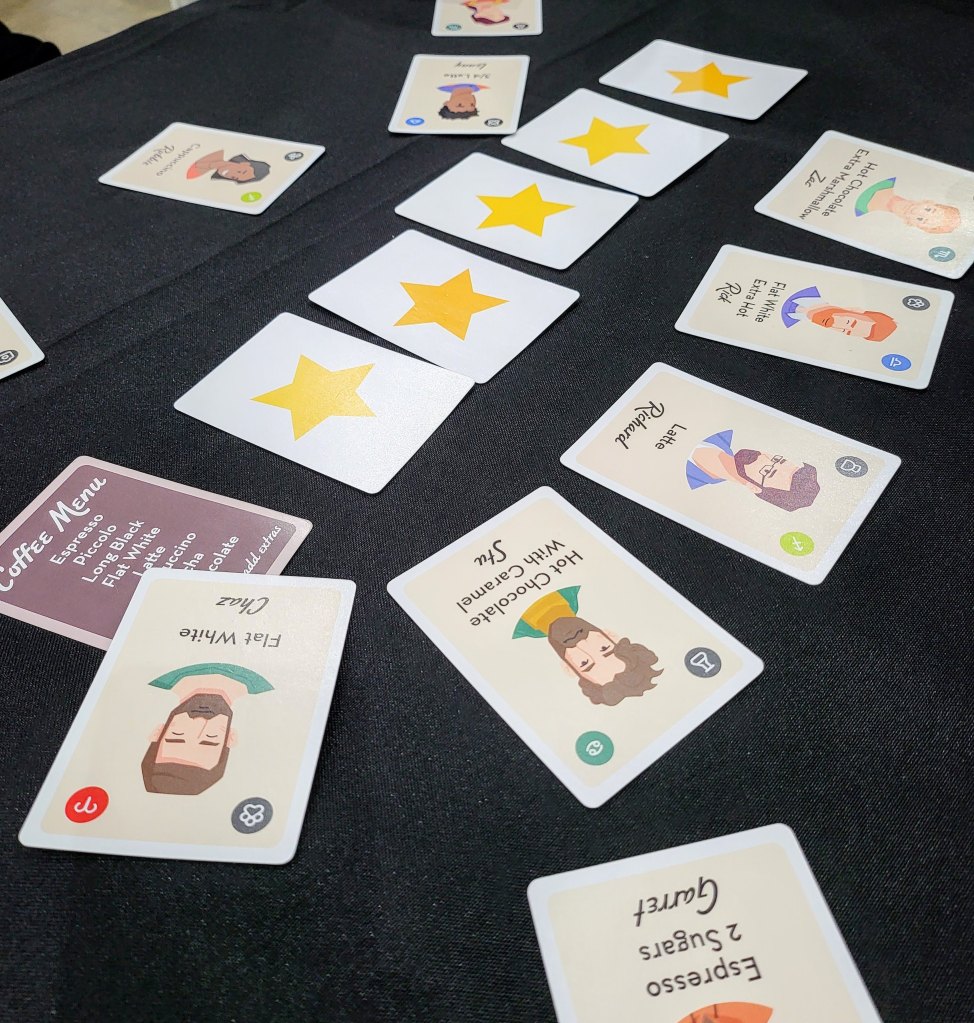 Coffee Up is a co-operative memory game where players make sure to please the customers of their new coffee shop, hoping to maintain a 5 star google reviews rating across the course of their first week of business. Each day, a number of customers will rock up. Players spend some time discussing their names and orders before shuffling the cards and dealing them out to to hold facing the rest of the players with the customer’s information hidden, only their portrait visible. Now the players need to remember either a name or coffee order for each patron. A mistake means a bad review and a drop in the rating of the business!