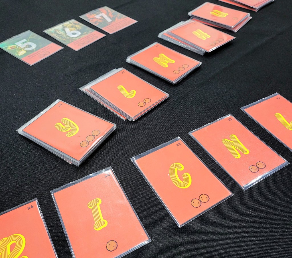 In Letter Spaghetti, players draft letter cards from some piles in the middle of the table. You keep the cards face up in front of you, and when it gets to your turn, you can either take another letter, or declare that you have a word in front of you and you are going to spell it out. The interesting twist happens here: when you declare, your letters don’t (and probably should not be) in the right order to make the word, and you are also allowed to add up to 3 virtual letter cards to the ones you have to make your word.
