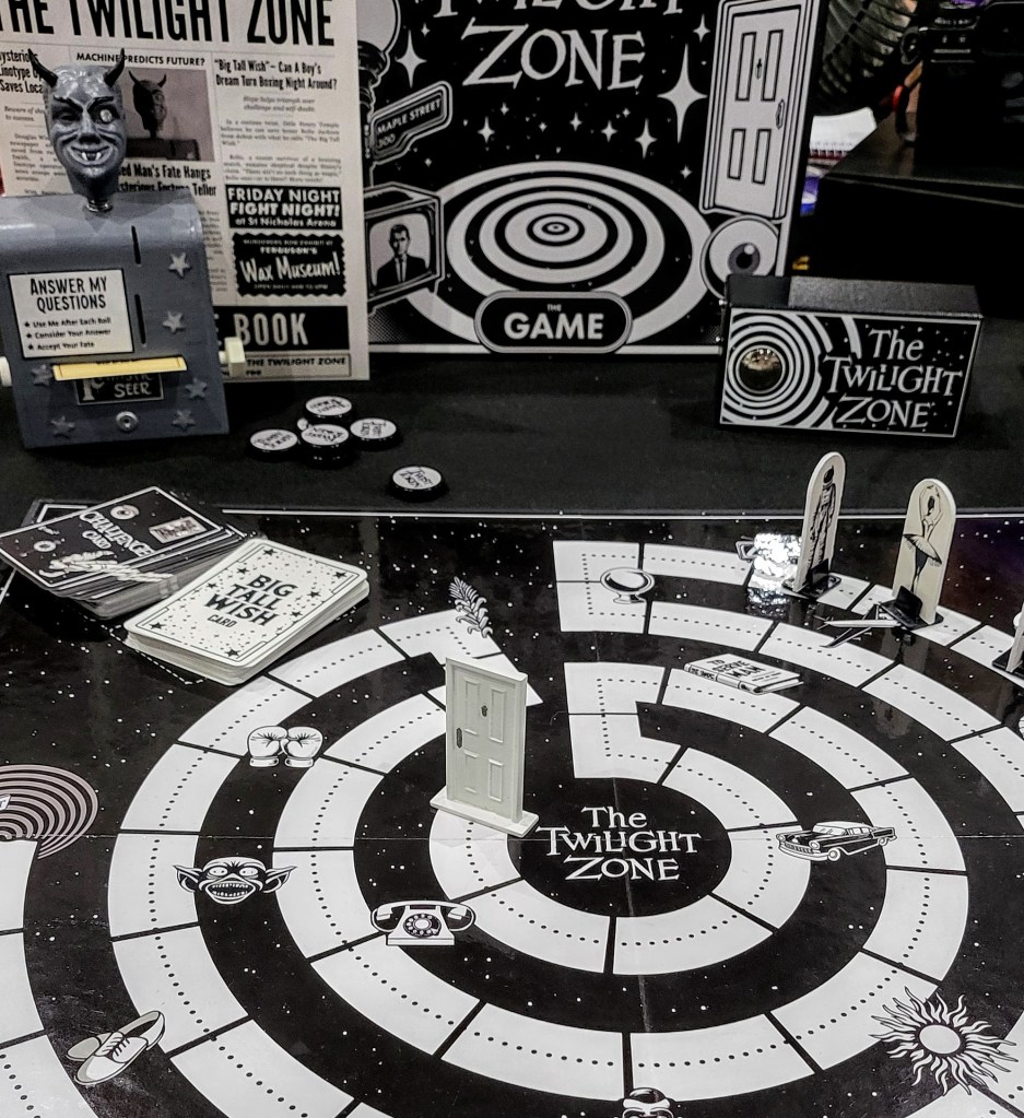 The Twilight Zone Game easily wins most outstanding table presence in the PAX Collaboratory in my book! Walking past the table I stopped and had a chat with Adam, who co-designed the game with his son Atticus. My first question was, of course ‘is this officially licensed?’. Adam was excited to report that after a hopeful email was sent off to Paramount Pictures without much expectation of any reply, it actually does have provisional licensing for playtesting, and pending approval, publication! He then asked me if I was a Twilight Zone fan, and I had to admit I have never seen an episode, but I am familiar with “The Scary Door”, a parody from TV show Futurama.