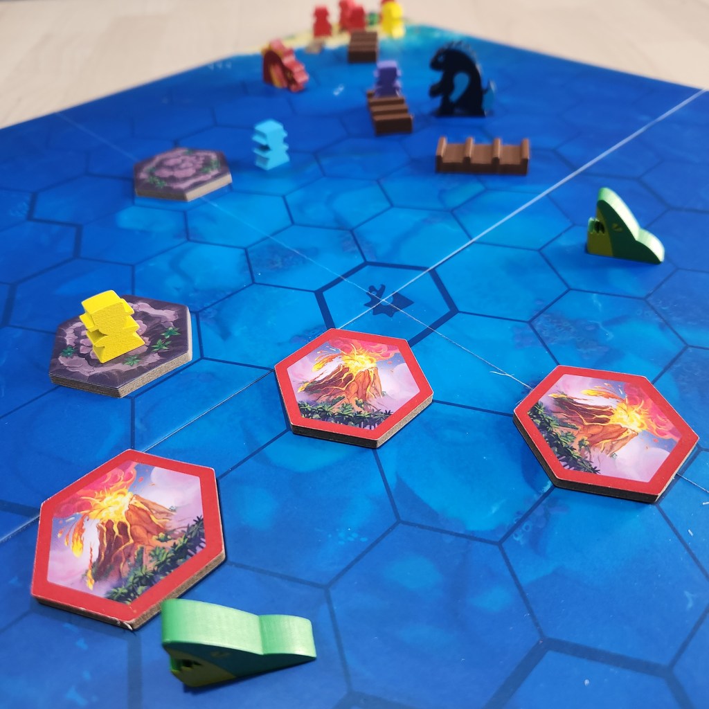 In Survive the Island, you race to rescue your meeples from a sinking island before 3 volcanoes erupt. While escaping to the safety of another island, you must also avoid the kaiju, serpents, and sharks, lurking in the water looking for rafts to smash and meeples to eat.