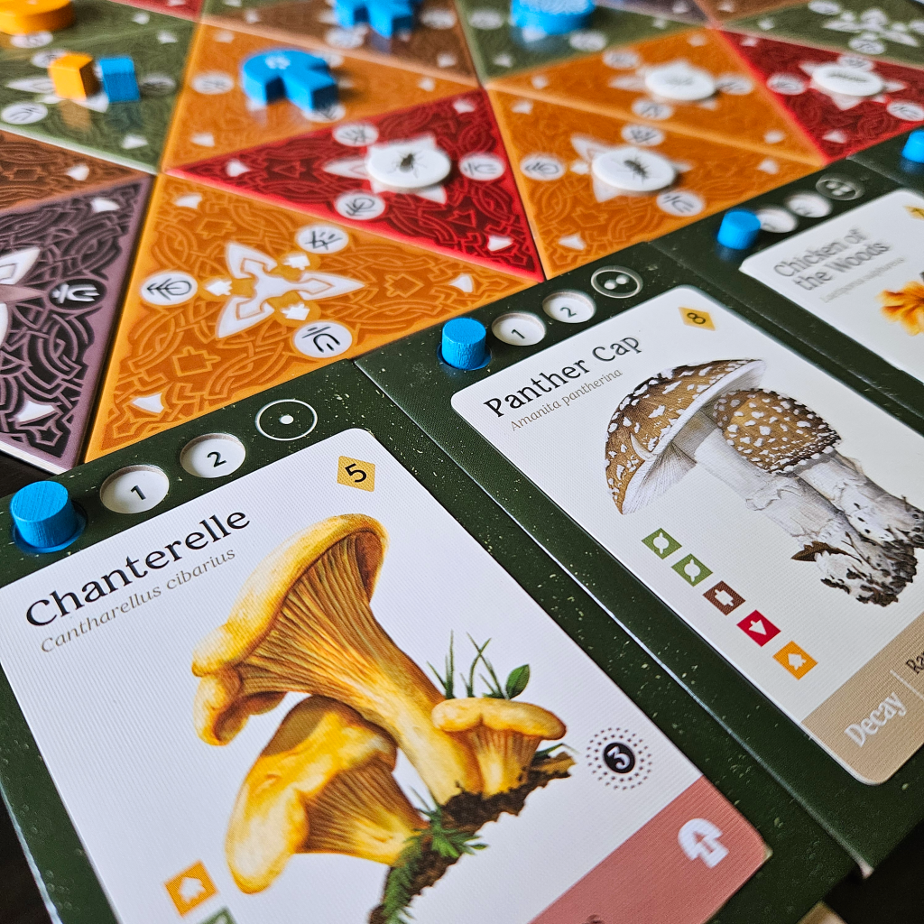 You can have five extra mushrooms active at a time, but once they have spored twice, they decay and need to be replaced. As they decay, they give you powerful bonuses, either one off or ongoing, but they also act as a countdown for the end of the game.