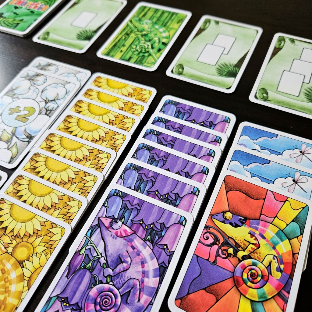 At two players the rules are a bit different. With more players each pool can hold up to three cards, but with this variant they can hold one, two and three cards respectively. You also reduce the number of colours used from seven down to five, making it easier to build good sets but also making the chance of losing a lot of points higher.