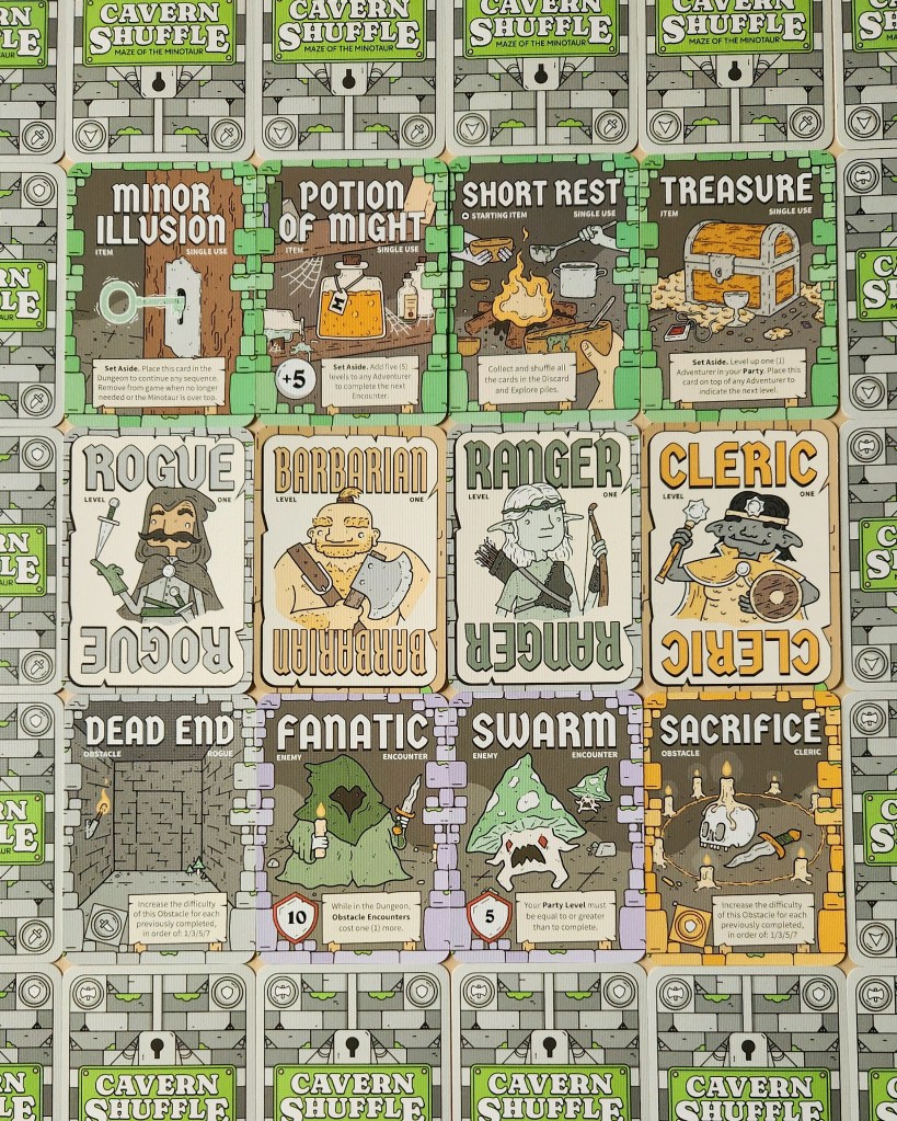 Cavern Shuffle is a solo dungeon crawl inspired card game that utilizes Solitaire mechanics. Your adventuring party consists of 4 different classes of adventurers, representing each of the 4 ‘suits’: Cleric, Rogue, Barbarian, and Ranger. In true dungeon crawl style, you must overcome a variety of Encounters and Obstacles, including a big bad – the Minotaur.