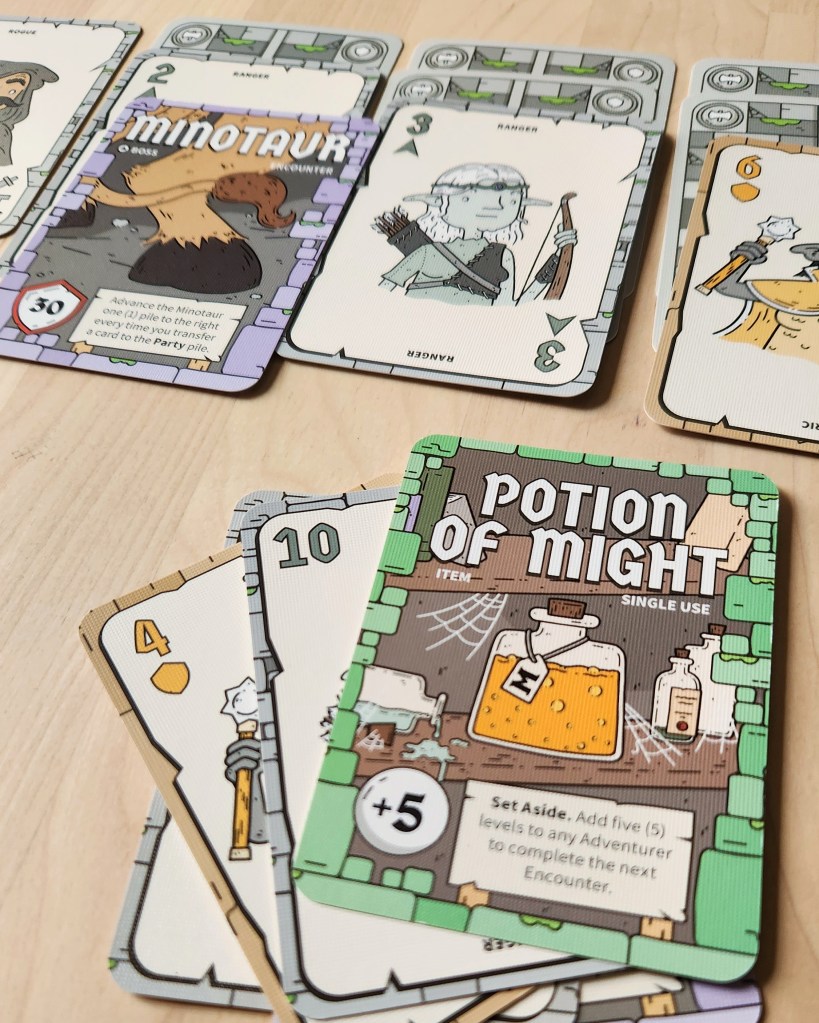 Cards played to the party area (known as foundation in Solitaire) become the strength of each adventurer, and combine to create your party’s total strength. Moving cards to the party area causes the Minotaur to move to the next row, blocking your path and ability to play or move cards there. Obstacles and Encounters are scattered throughout the cards. To defeat them, an individual adventurer or the party (respectively) must have reached a minimum level of strength. Loot found while navigating the dungeon can be used to aid a hero or the party in overcoming Obstacles and Encounters. The game is won as soon as the party defeats the Minotaur, unlike in classic Solitaire, where all cards must be moved to the foundation.