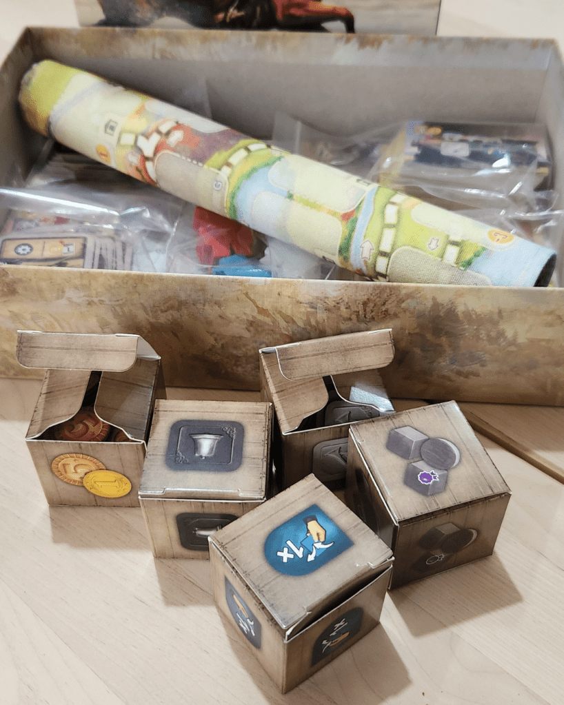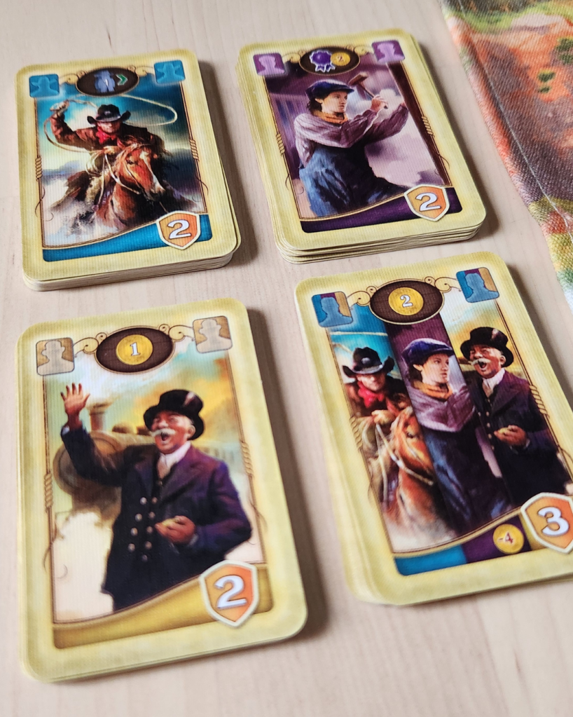 Coming in at a cheaper price point, GWT: EL Paso doesn’t have wooden components (with the exception of the herder) or thick player boards like other versions of GWT. The main board is a folded linen mat that definitely needs an iron before playing. Players who prefer premium components may not find this game appealing; however, I haven’t found the component quality to decrease my enjoyment of the game. My only issue so far has been the component containers; if closed completely, they tear very easily when trying to reopen them.