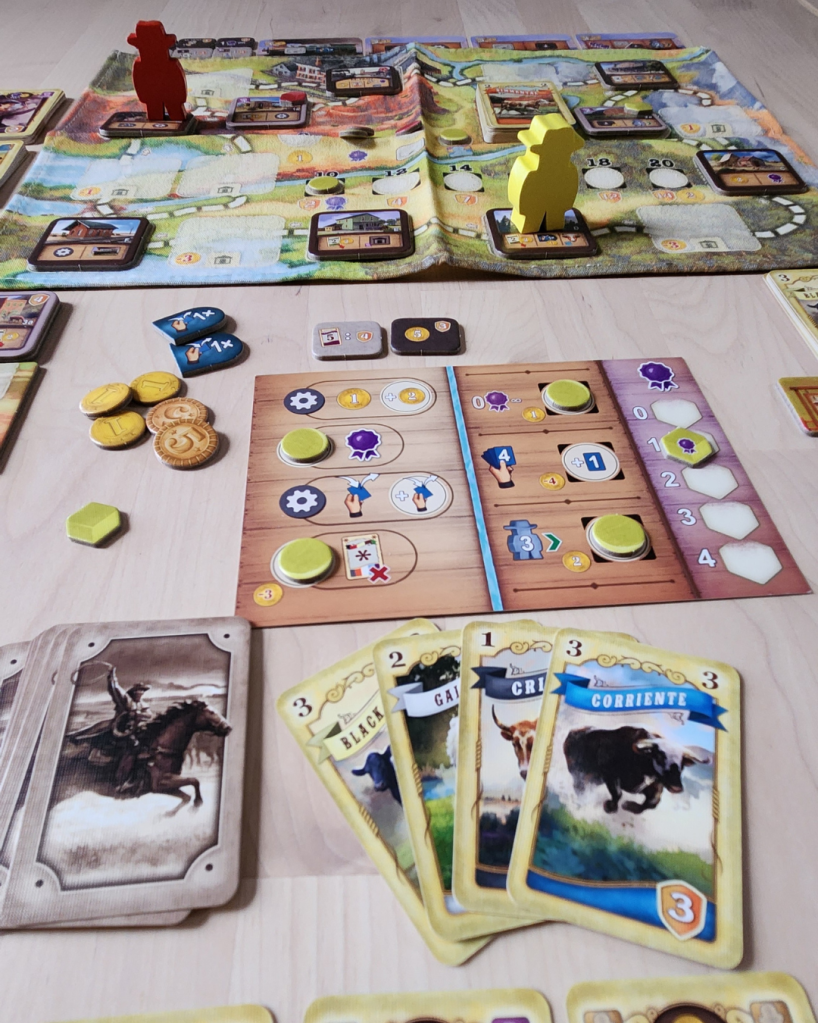 On the trail to El Paso, players buy and sell cattle, and hire workers who will help them sell cattle, build new buildings (which become locations they can visit), and take the train to gain bonuses. At El Paso, players must stop and sell their cattle, and gain points based on their breeding value. Players can use certificates to increase their cattle’s breeding value or swap out cows with a lower value in hopes of gaining a higher value cow. The player with the most victory points (from cattle, workers, buildings, objectives, bonuses, and coin) at the end of the game is the winner.