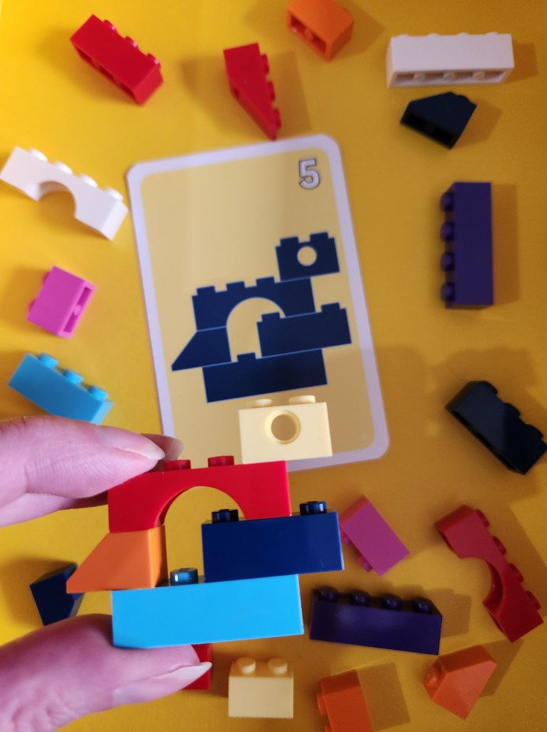 Where the game really began to shine, though, was when we added in the challenge cards. For us, they made the cards just the right amount of challenging, while still keeping it fun. They also added some silly, much-needed goofiness to the game. I was quite proud of myself when I managed to complete a build with my eyes closed! Another card I managed to successfully give instructions for without speaking; I did it all in mime!